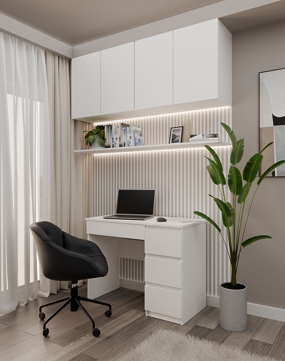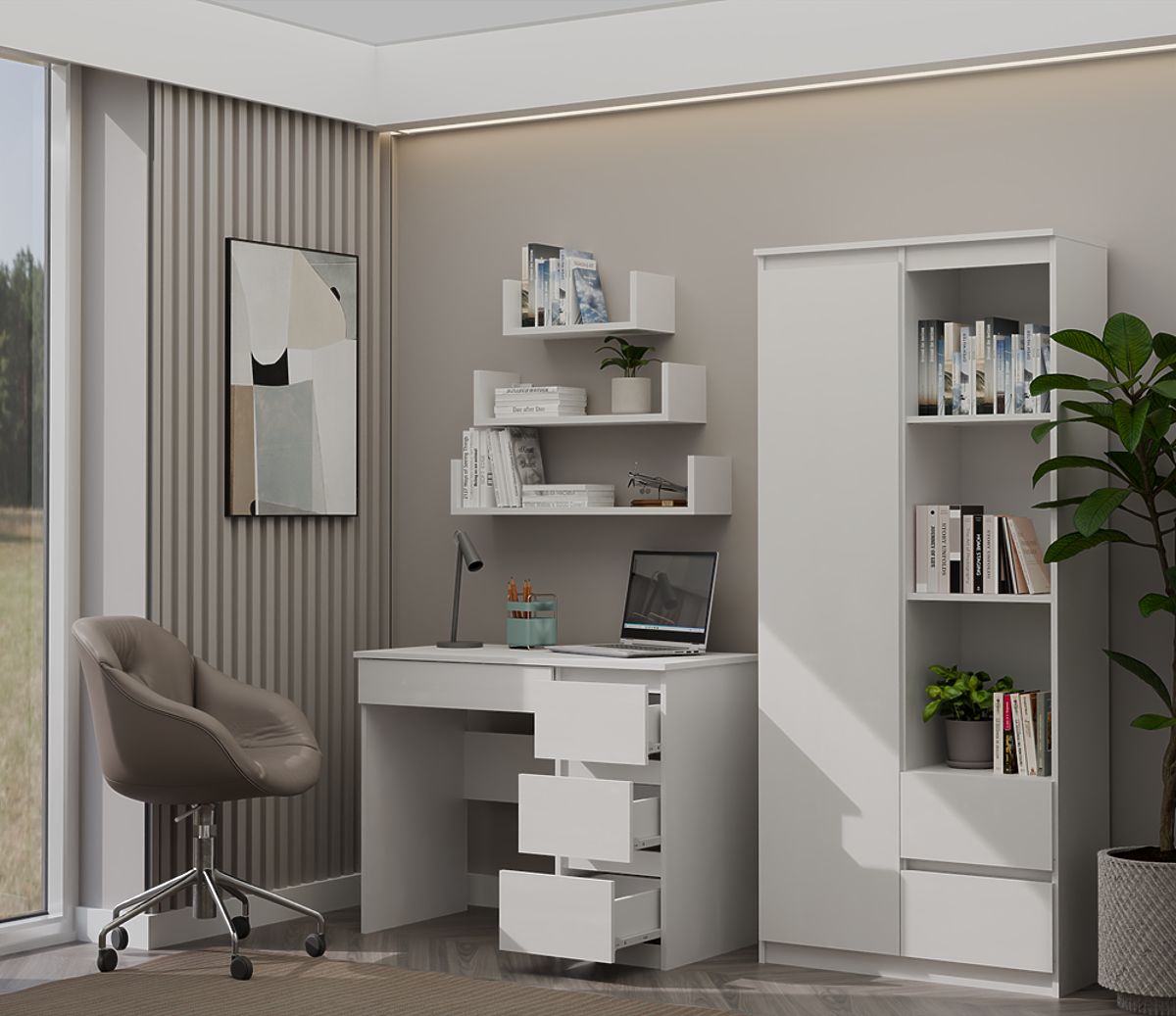 COULEUR : BLANC Le bureau modèle « MIJAS » est parfait pour les pièces à la maison et les bureaux. Emplacement idéal pour un ordinateur portable. Façades de tiroirs sans poignées. 3 tiroirs hauts et spacieux à gauche et un tiroir bas à droite sous le plateau. Design simple et moderne pour un espace de travail confortable. Côtés lisses sans couvercles. Montage facile. Notice de montage incluse. Fabricant tchèque (si vous le souhaitez, je peux ajouter « Fabricant polonais » - indiquez votre préférence). MATÉRIAU : Structure et façades - panneaux de particules mélaminés de 16 mm.