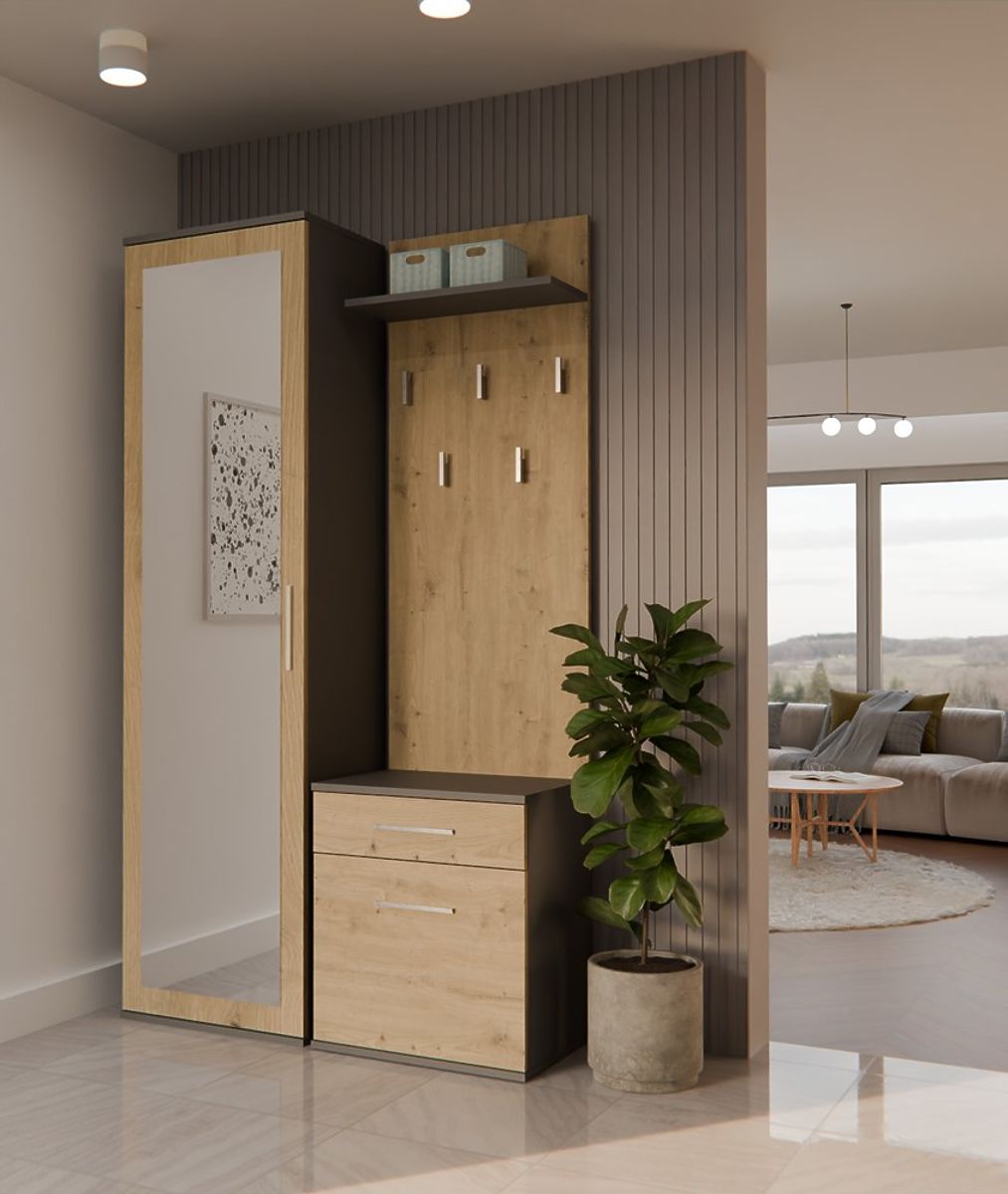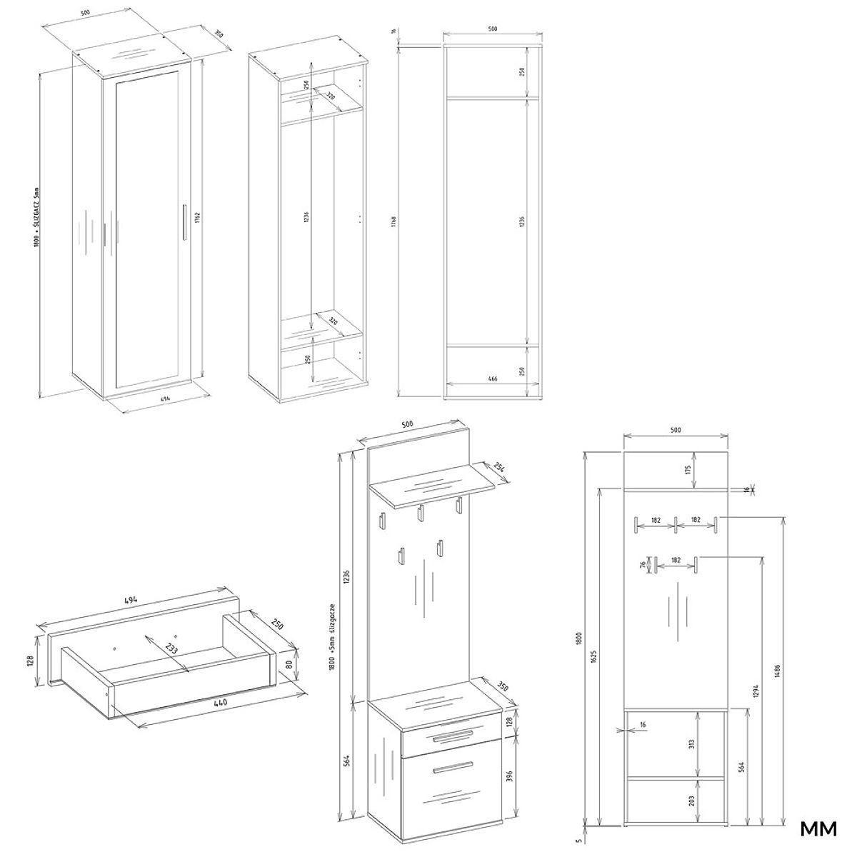 L'armoire avec miroir, la petite armoire et la patère peuvent être placées ensemble ou séparément.
