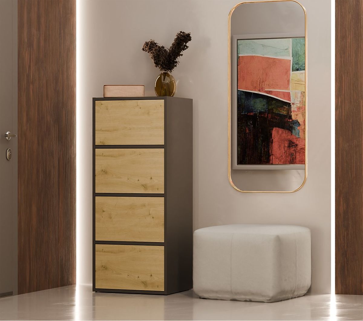 Grâce aux étagères spacieuses cachées derrière des portes lisses, la commode offre beaucoup d'espace de rangement et facilite le maintien de l'ordre dans chaque espace.