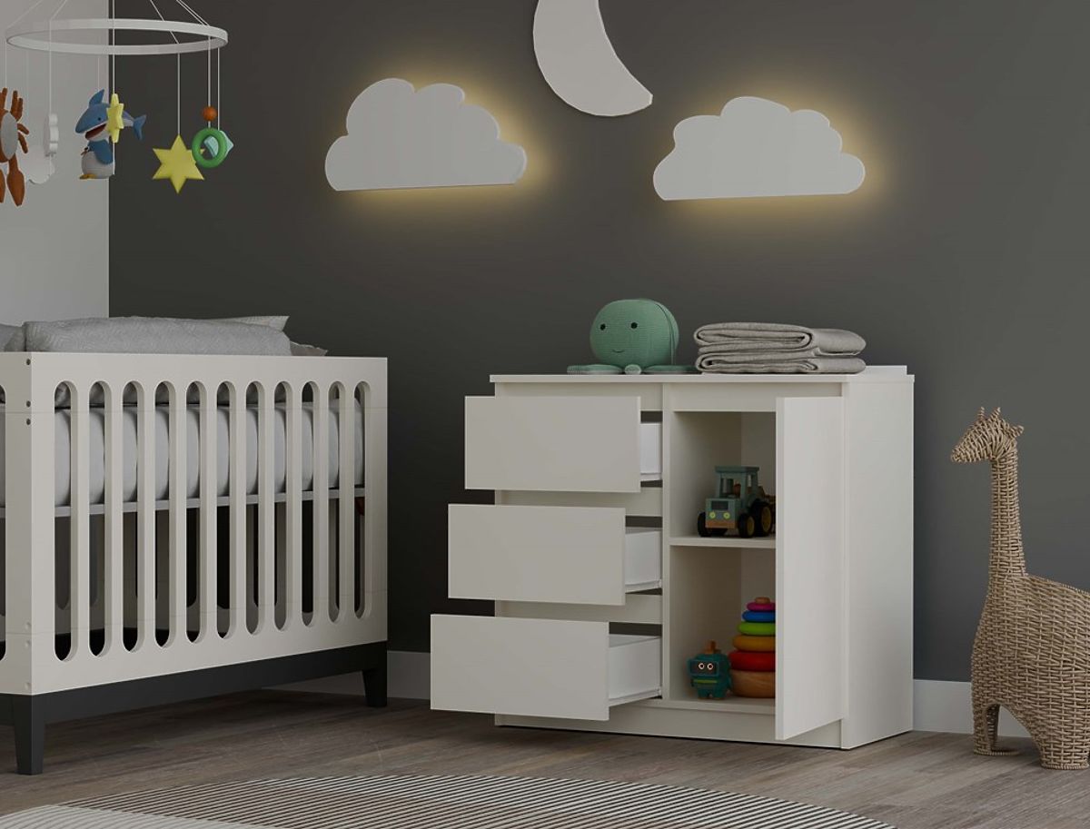 La commode 1D3S est un meuble stylé et pratique, idéal pour la chambre, le salon, l'entrée ou la chambre d'enfant. Grâce à son agencement réfléchi avec une porte et trois tiroirs spacieux, elle offre un rangement et une organisation de l'espace confortables.