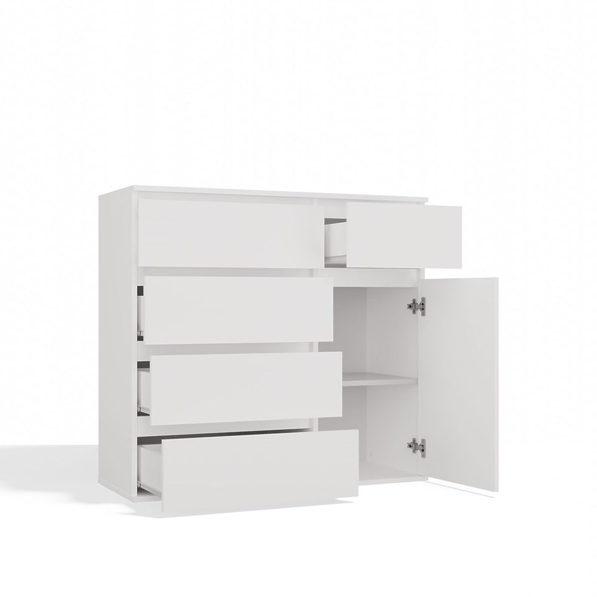 Commode blanche avec 1 porte et 5 tiroirs pour un rangement pratique. .. plus
