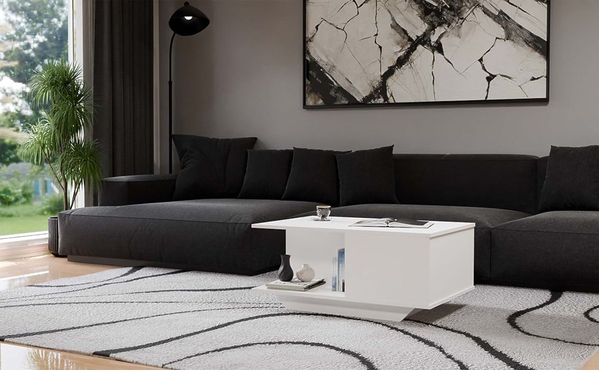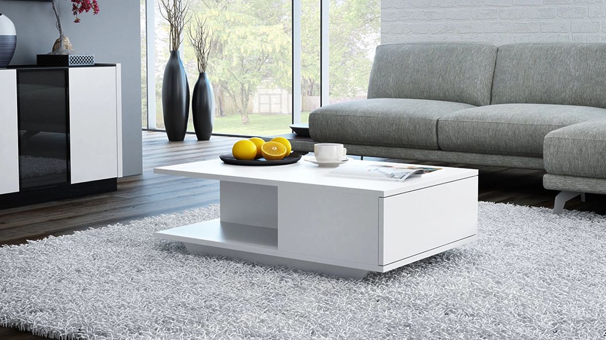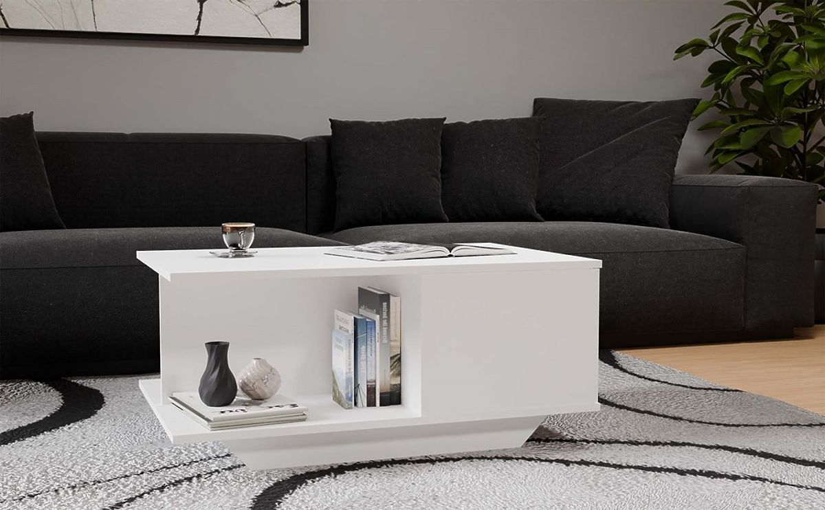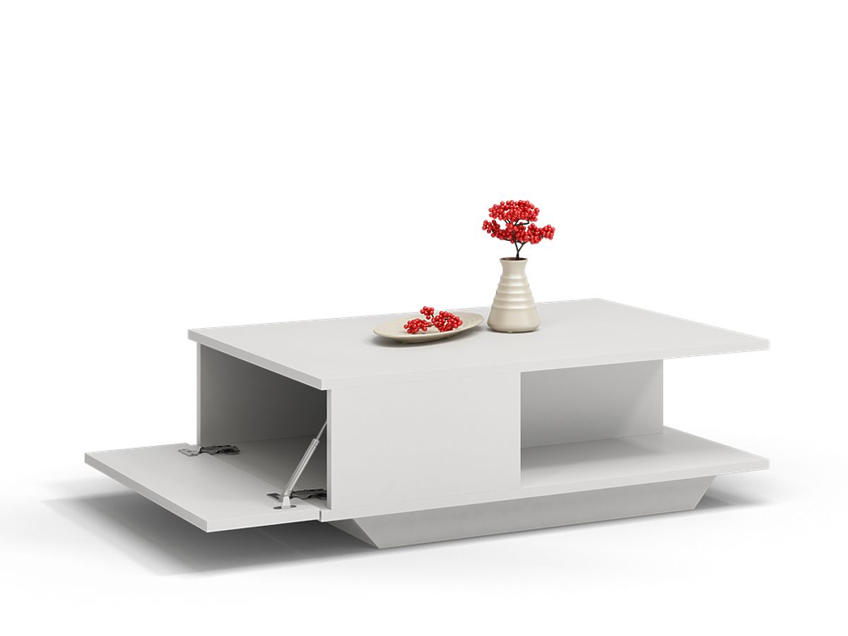 Table basse blanche avec espace de rangement fonctionnel. .. plus