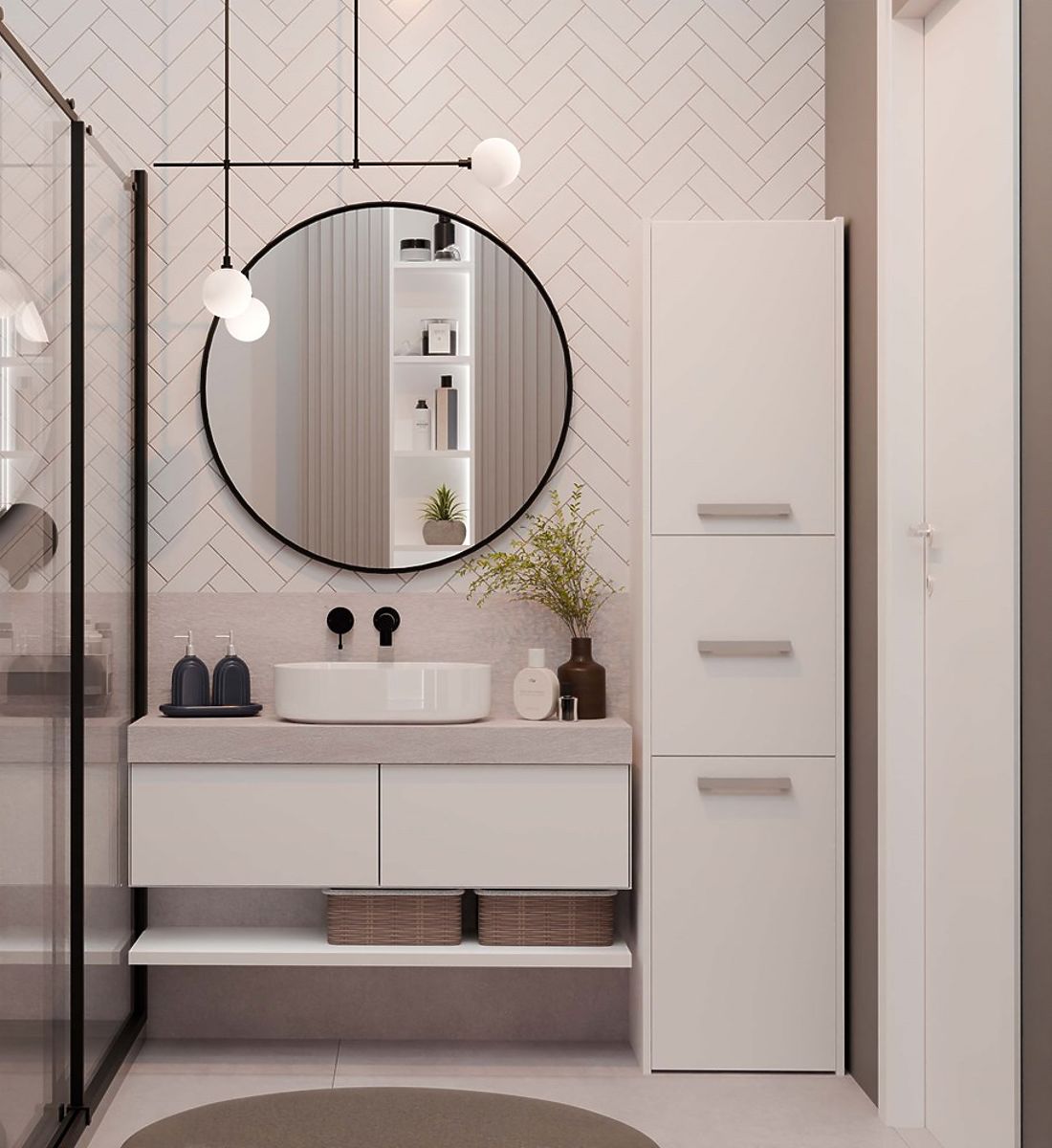 Armoire de salle de bain moderne avec trois portes et finition blanche. .. plus
