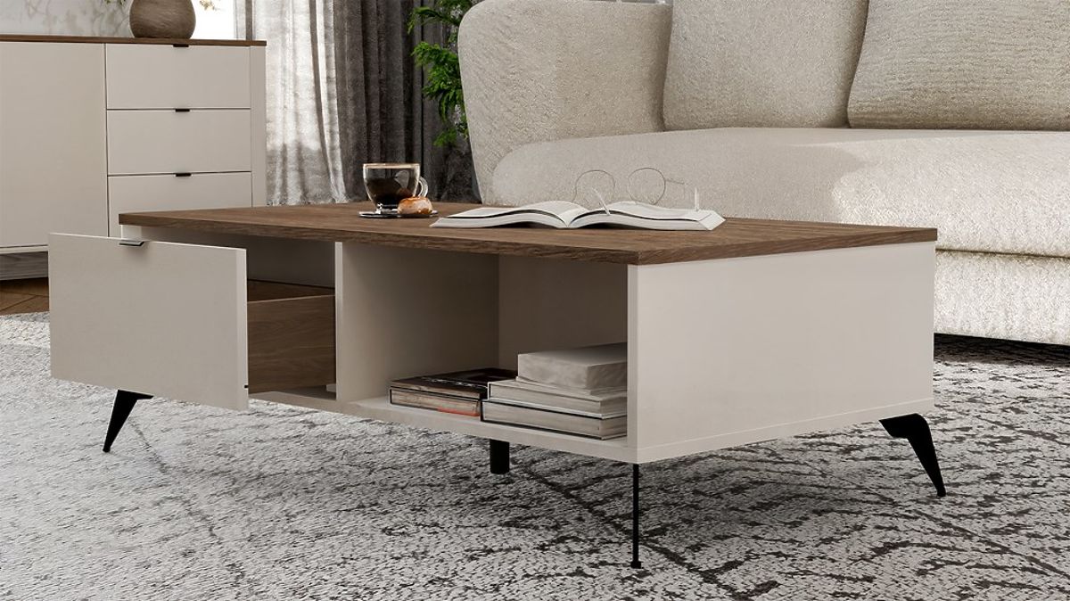 Table basse CORDOBA Beige Cachemire Chêne Castello 2 Tiroirs pour Salon