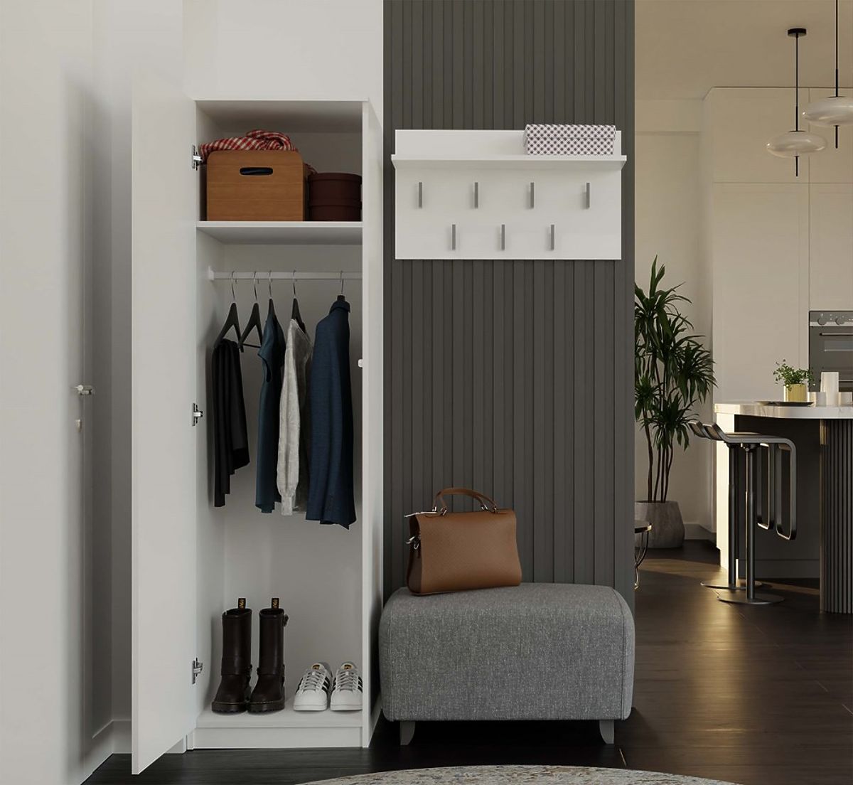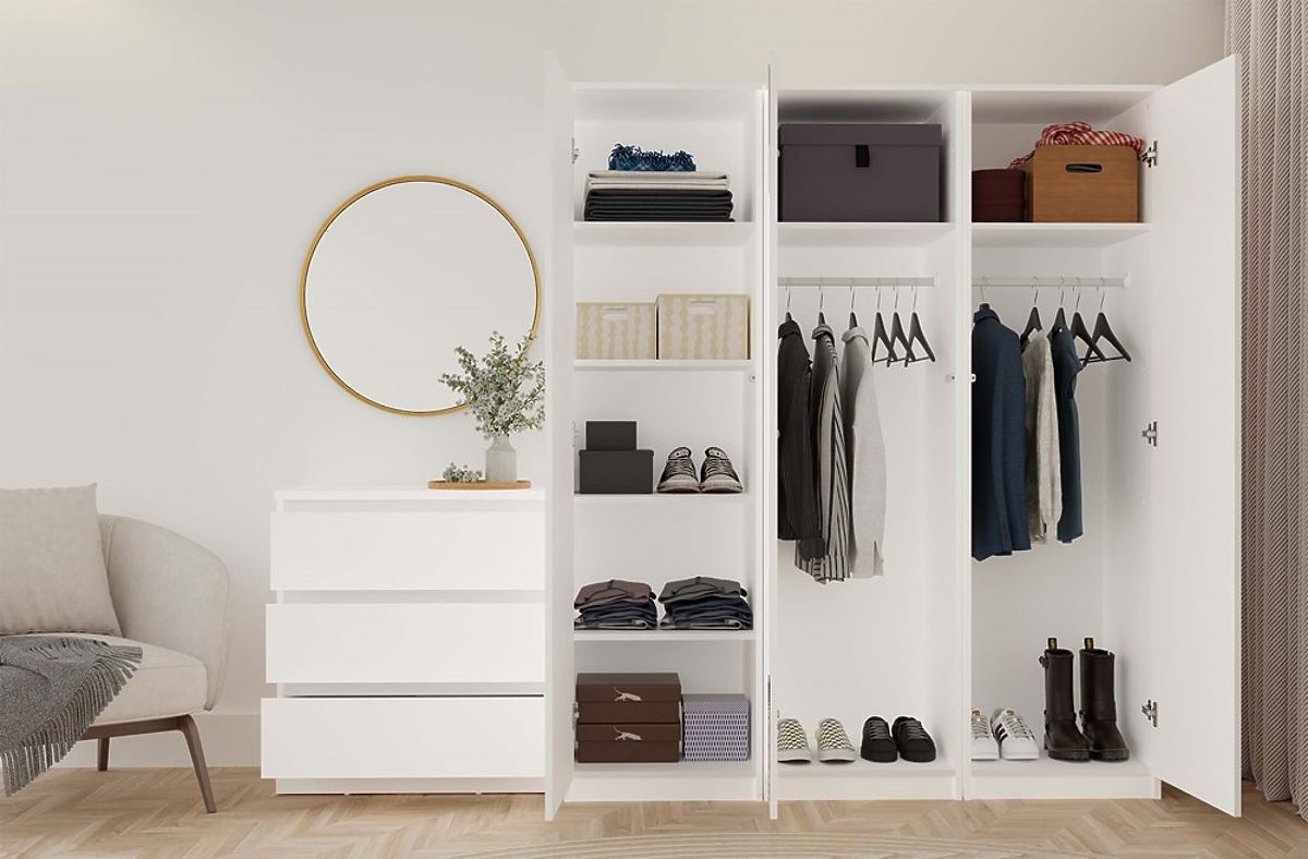 Inclus dans l'emballage : 4 étagères et 1 tringle – l'agencement est à choisir lors du montage selon l'usage.