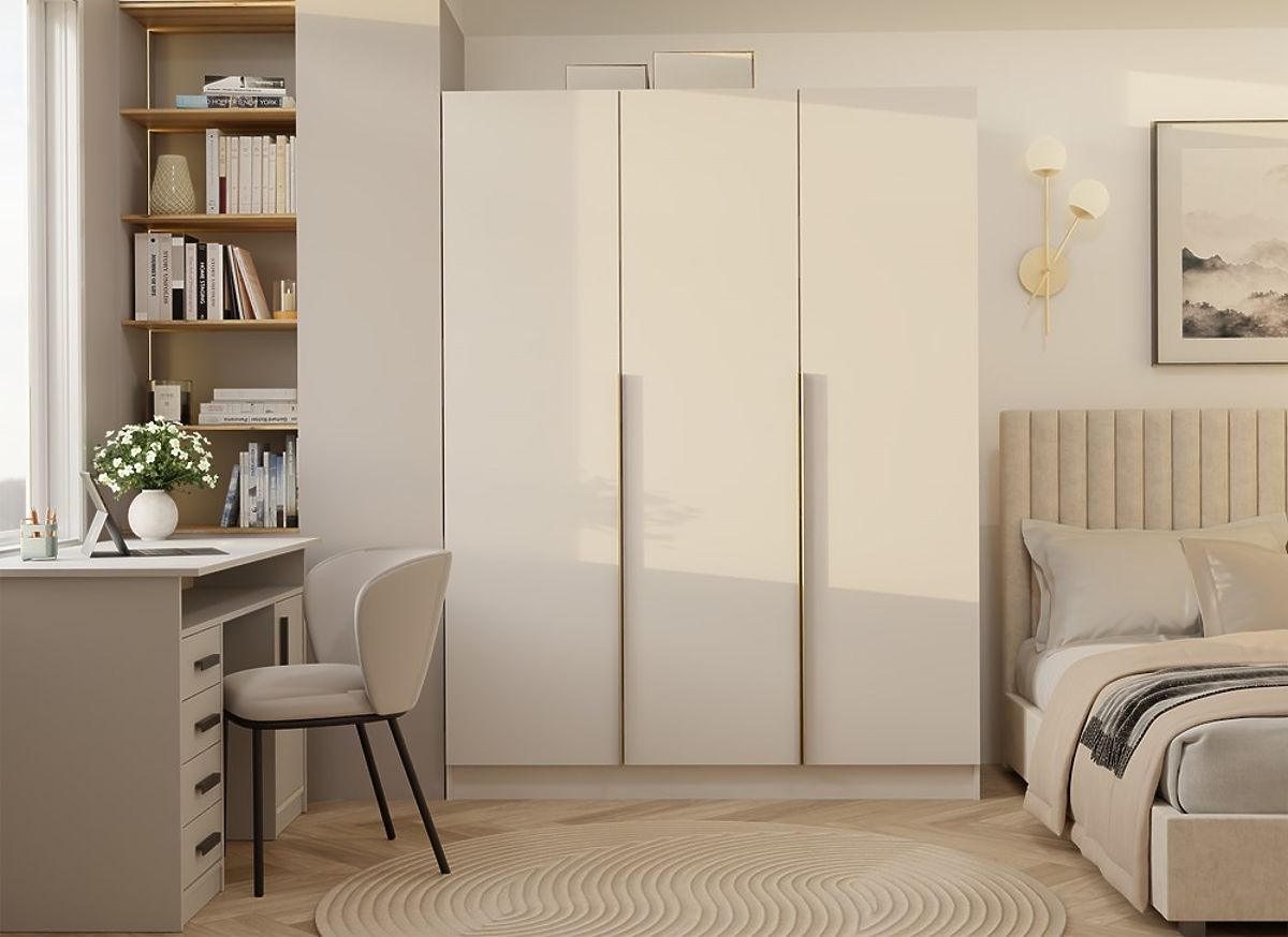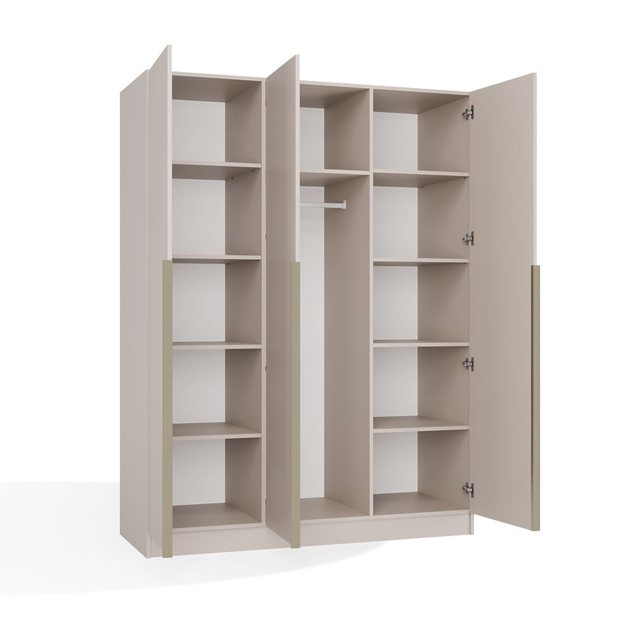 Si vous recherchez une combinaison de minimalisme, d'élégance et de fonctionnalité exceptionnelle, l'armoire SENSO 3D est faite pour vous. Cette armoire à trois portes se distingue par sa forme simple, sa finition mate couleur cashmere et ses poignées dorées caractéristiques en teinte or brossé, soulignant son caractère luxueux.