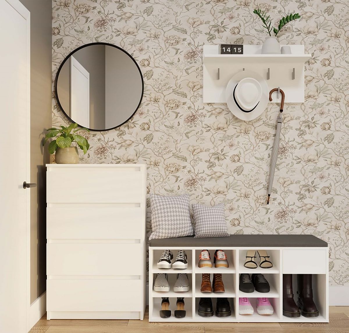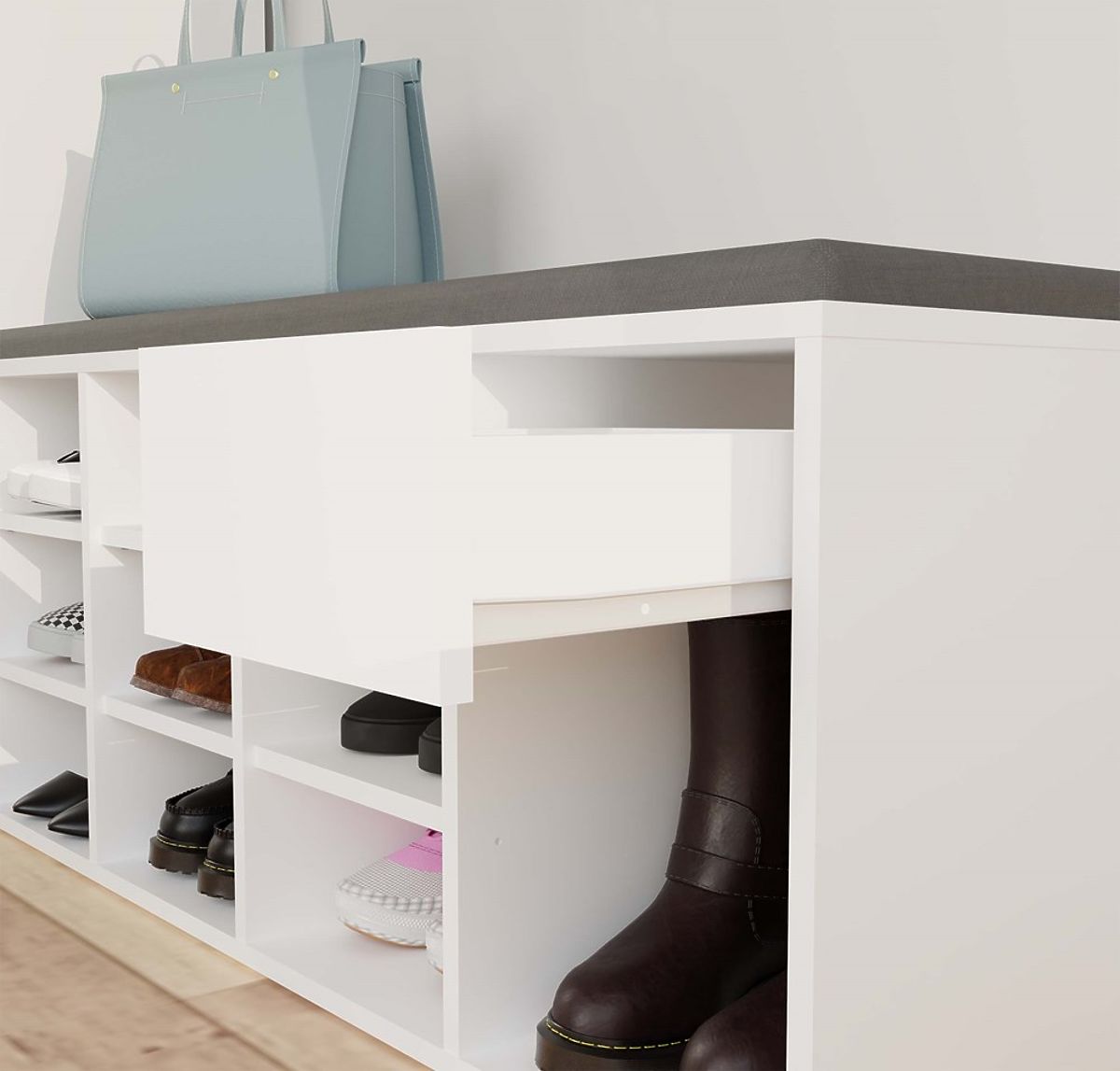 Armoire blanche TALLIN avec siège et 9 compartiments pour l'entrée. .. plus