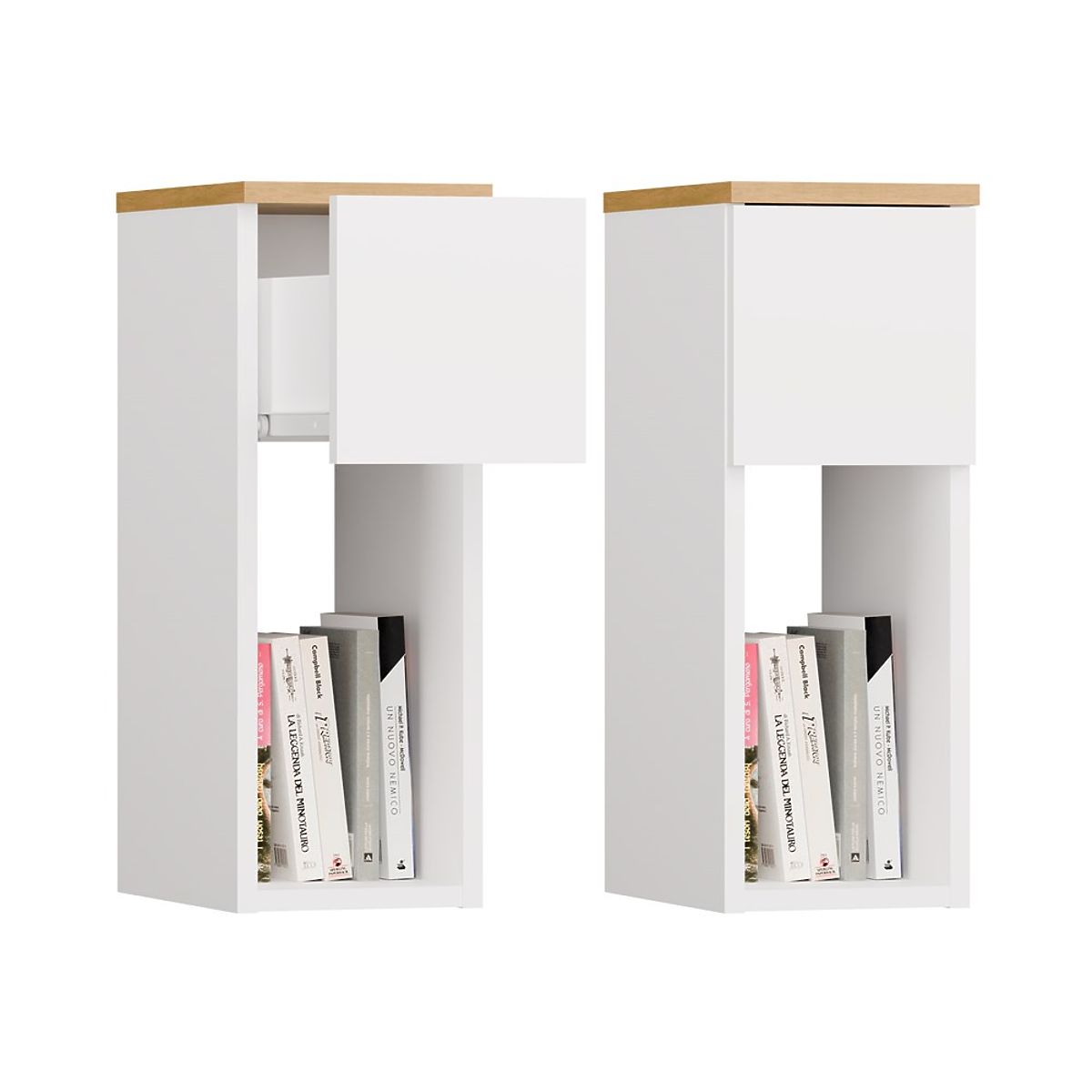 Table de nuit avec tiroir et étagère ouverte, couleur blanc et chêne artisan. .. plus