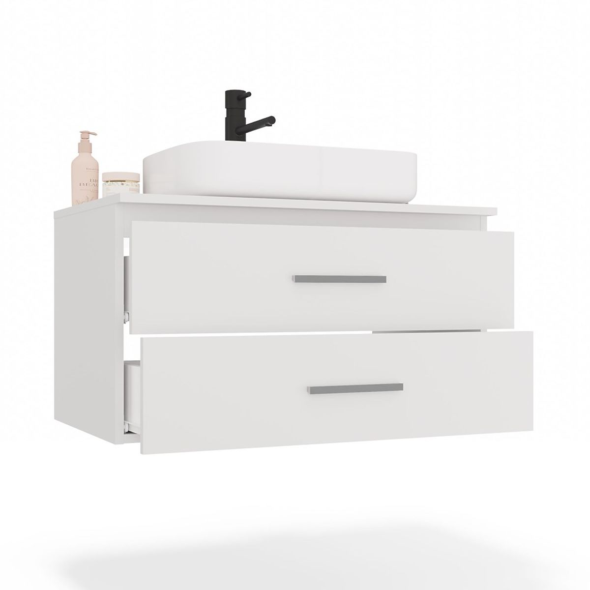 Le meuble est équipé de deux tiroirs spacieux, parfaits pour ranger des cosmétiques, des serviettes ou d'autres accessoires de salle de bain. Les deux tiroirs ont une profondeur complète - sans découpes pour le siphon. L'utilisation d'un siphon mural permet de maximiser l'espace disponible.