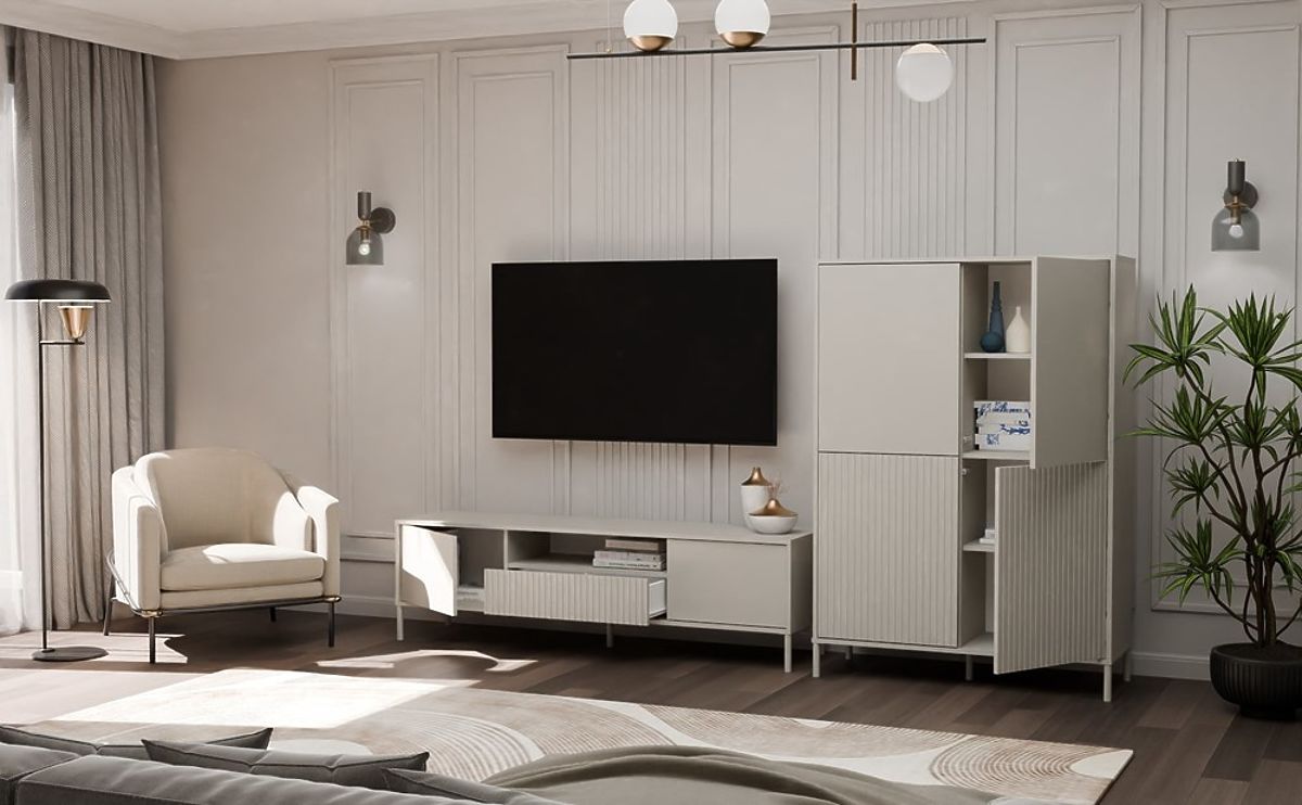DESIGN ET FONCTIONNALITÉLe meuble TV KAMARO est la solution idéale pour ceux qui apprécient le style moderne et les solutions pratiques. Sa construction minimaliste et ses façades rainurées lui confèrent un caractère unique, tandis que l'agencement réfléchi des étagères et des placards permet un rangement et une organisation de l'espace confortables.