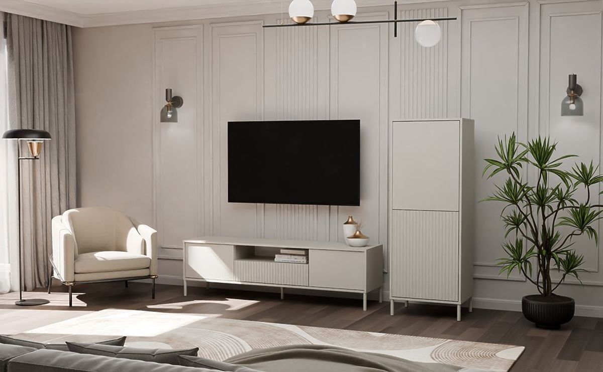 ÉLÉGANCE ET PRATICITÉ EN UNLa vitrine KAMARO 2DK SLIM/LISSE CACHEMIRE est une combinaison d'esthétique et de fonctionnalité, idéale pour le salon, la chambre d'amis, la chambre ou le bureau. La combinaison de portes avec un panneau frontal lisse et un panneau frontal strié rappelant des lamelles ajoute du caractère, et le système TIP-ON permet une utilisation confortable sans poignées. Le meuble offre un espace de rangement suffisant tout en étant un élément stylé dans un intérieur moderne.