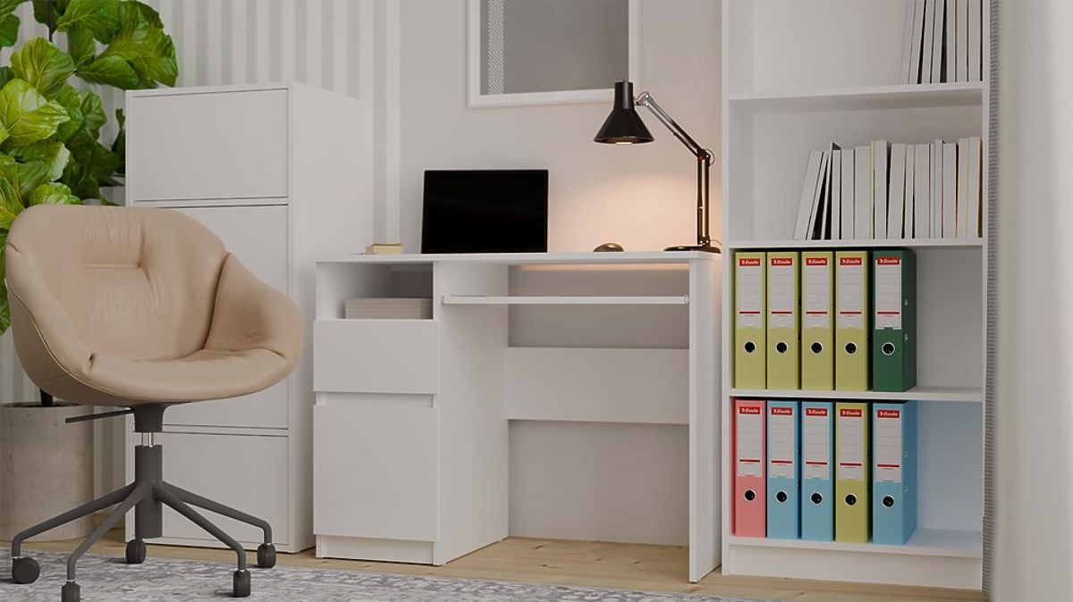 Bureau blanc avec tiroir, armoire et étagère pour clavier. .. plus