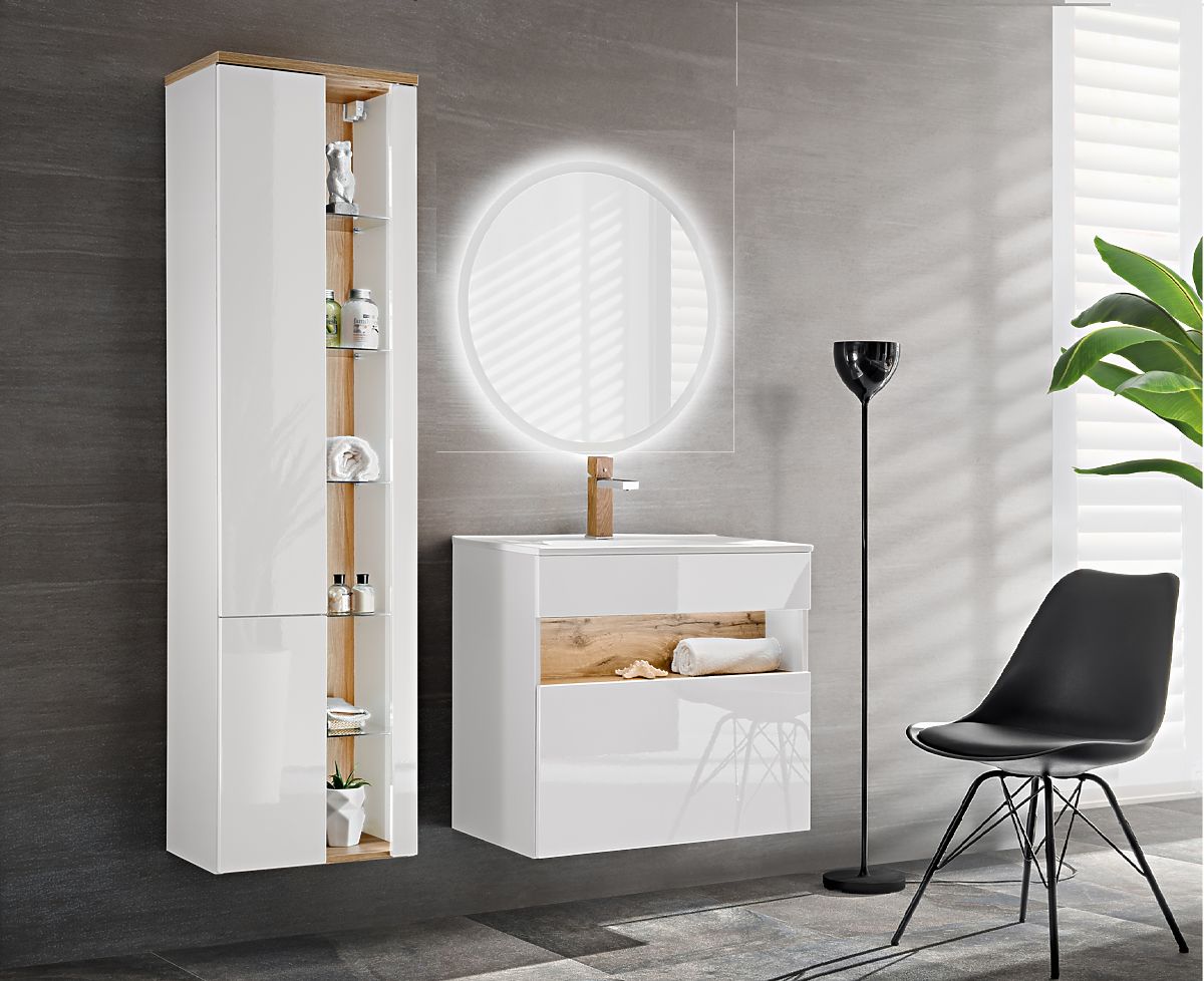 Meuble sous lavabo avec un tiroir, couleur Blanc et Chêne Wotan. .. plus