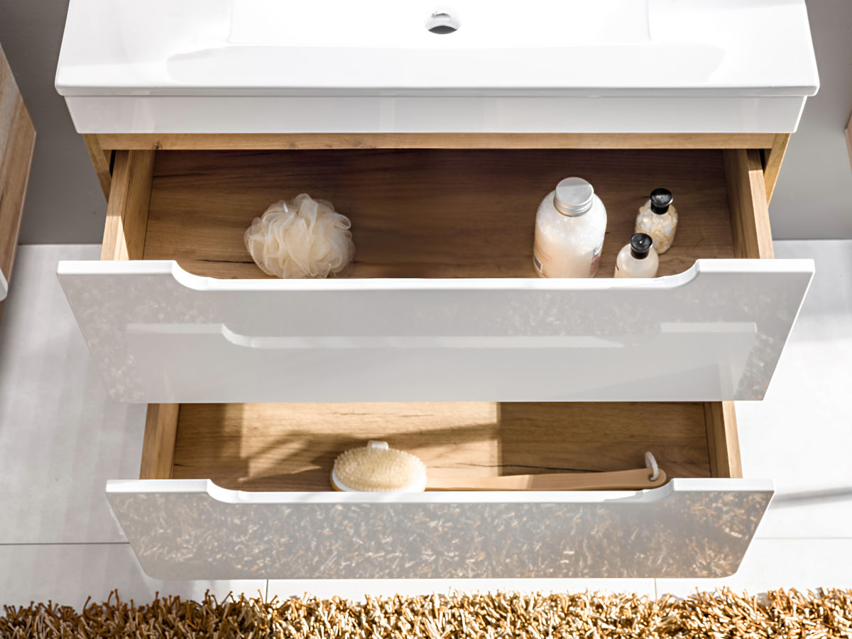 Meuble sous lavabo avec deux tiroirs et finition blanc brillant. .. plus