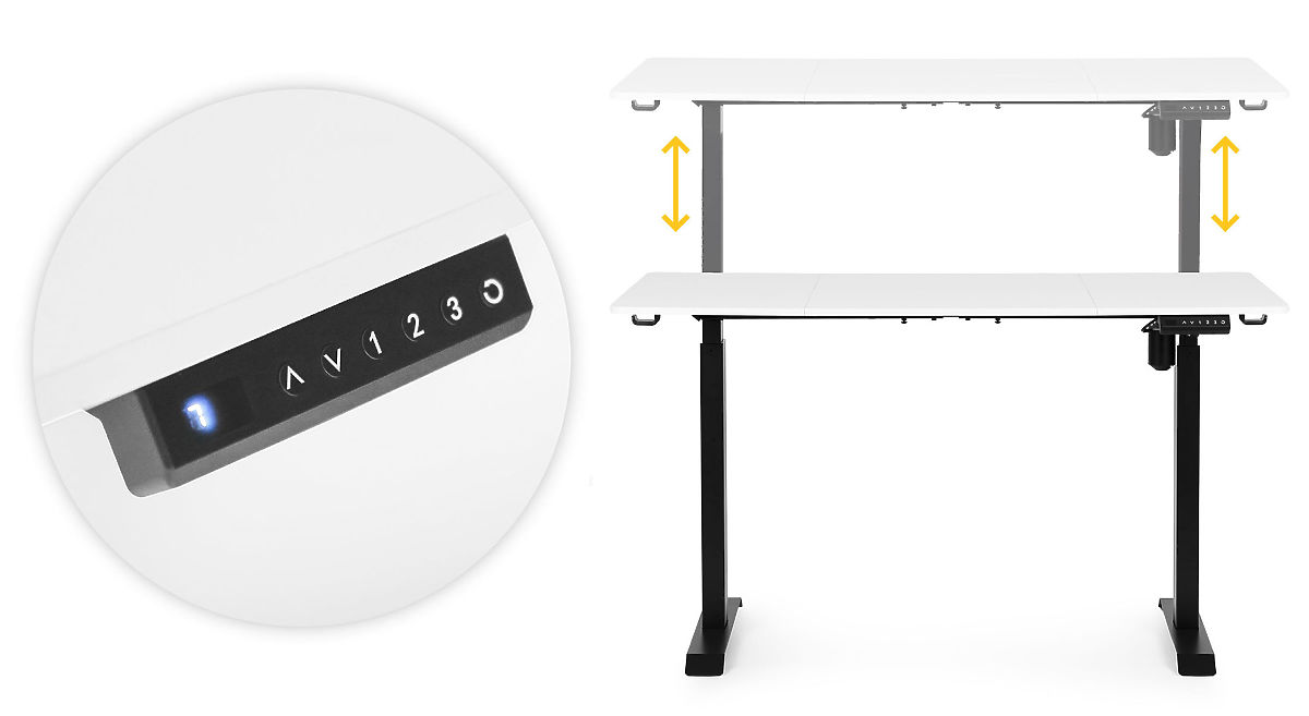CONTRÔLE TOTAL À PORTÉE DE MAINLe panneau de commande intuitif avec boutons haut/bas permet de régler précisément la hauteur du plateau, et trois boutons numériques permettent de mémoriser les positions préférées. De plus, il est possible de régler un rappel de changement de position toutes les 30, 45 ou 60 minutes, ce qui encourage le maintien de bonnes habitudes de travail.