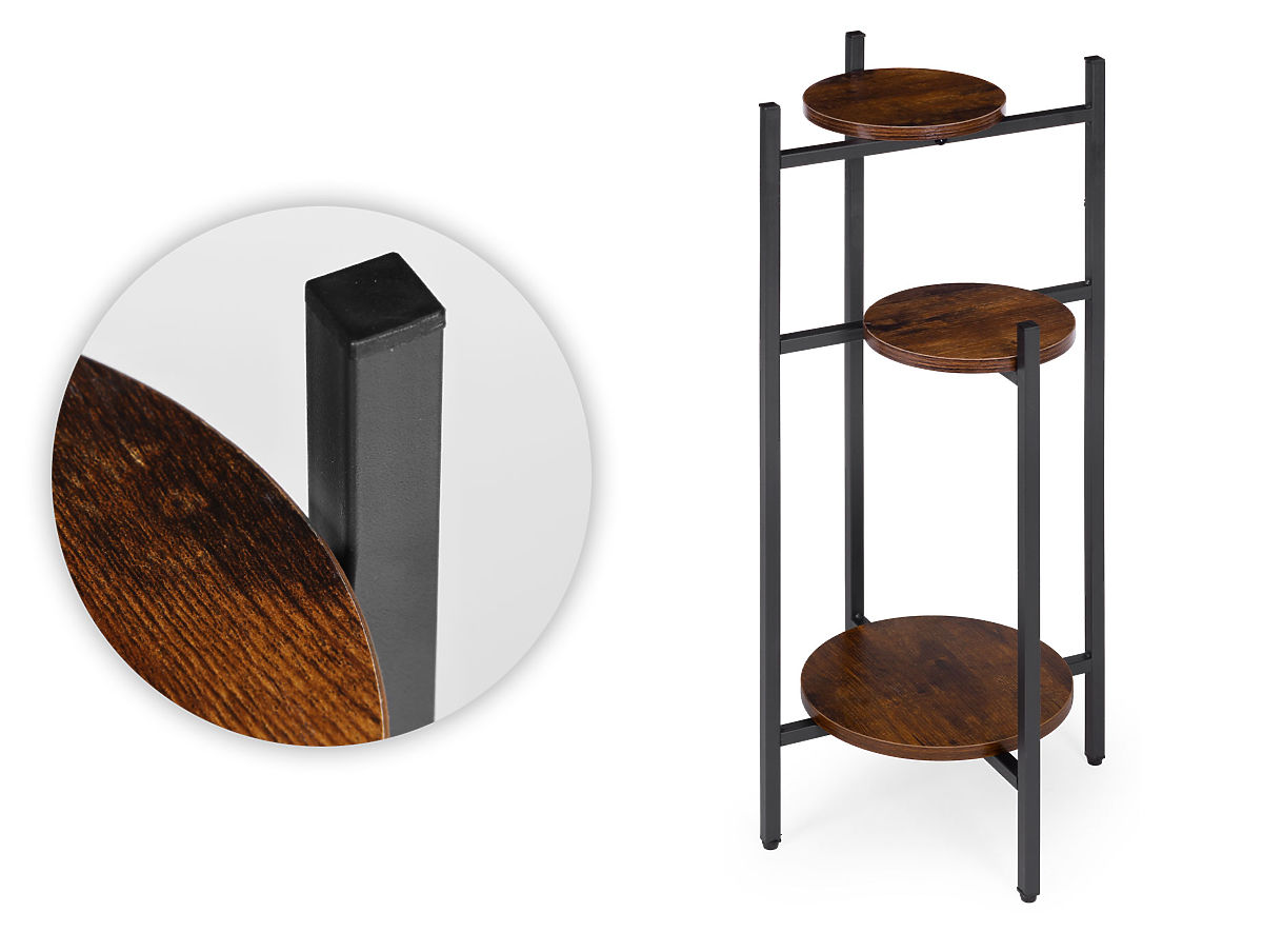 MATÉRIAUX DURABLESLe support pour plantes est fabriqué en acier avec revêtement en poudre, assurant une résistance à la corrosion et aux dommages mécaniques. Les étagères en aggloméré sont finies dans une couleur imitant le bois naturel, soulignant le caractère décoratif et loft du meuble.