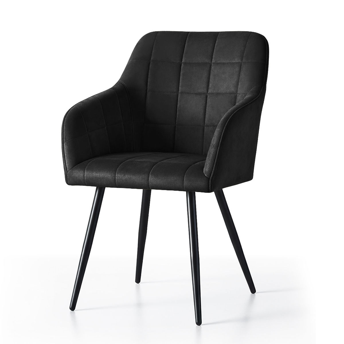 Chaise rembourrée noire avec surpiqûres carrées et pieds en acier. .. plus