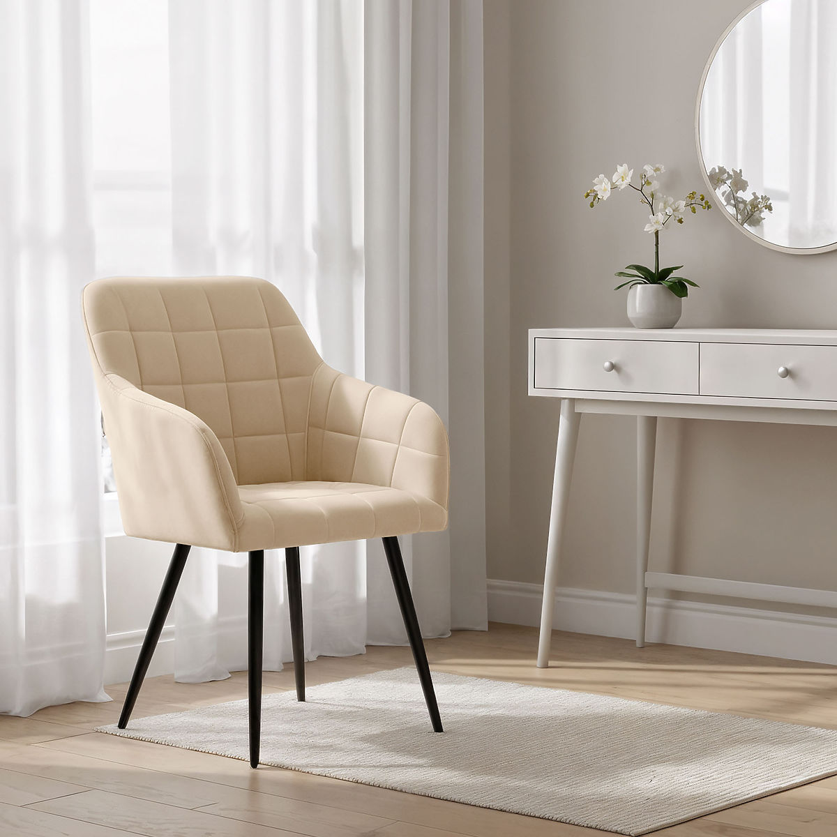 Chaise rembourrée beige avec coutures carrées et pieds noirs. .. plus
