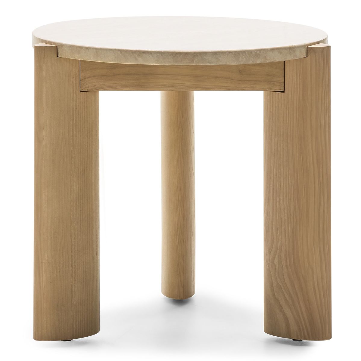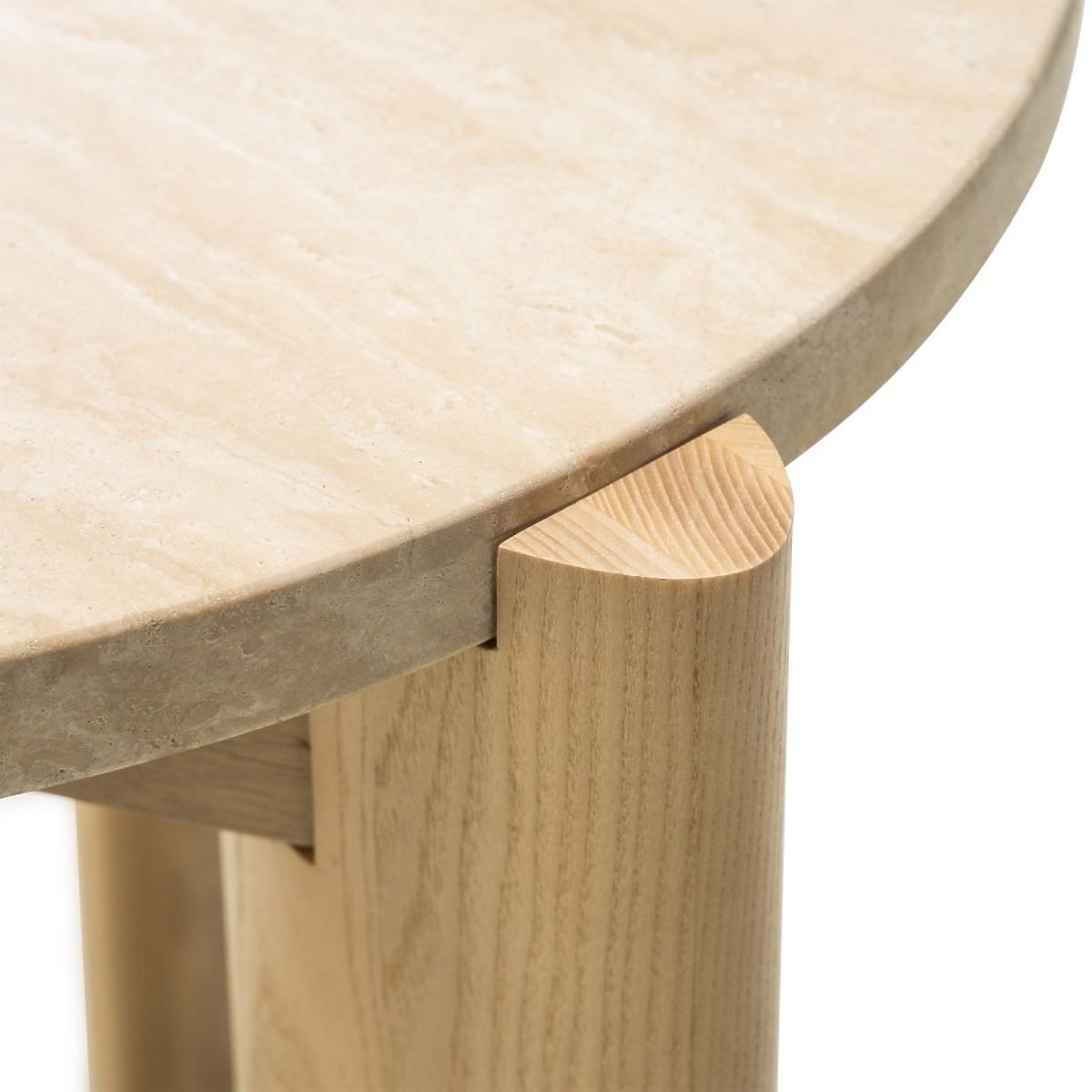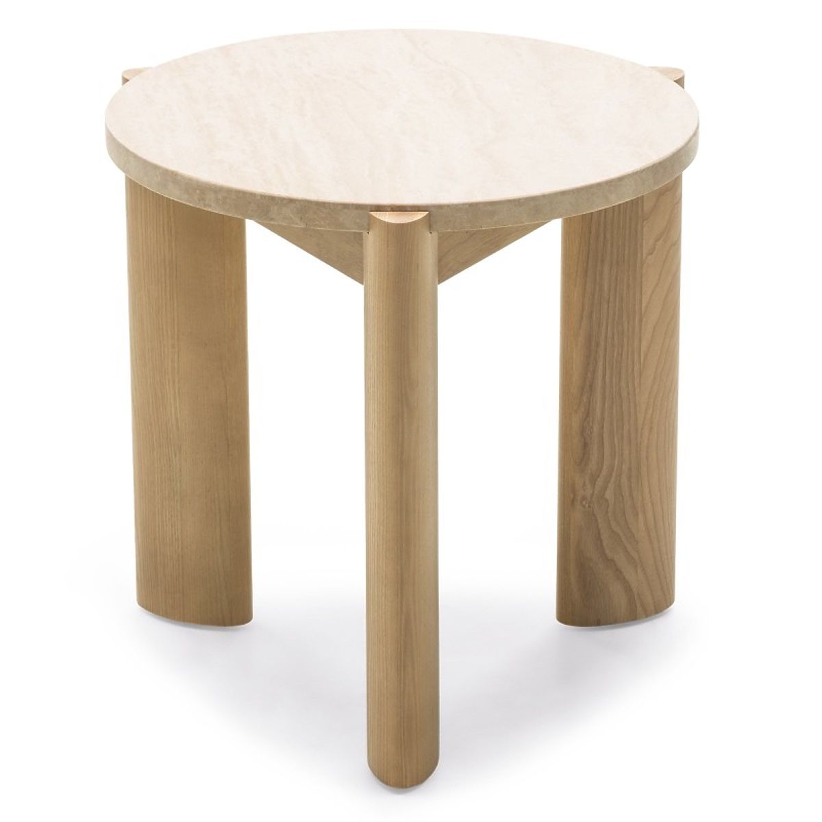 Table d'appoint ronde en travertin avec pieds en bois de frêne. .. plus