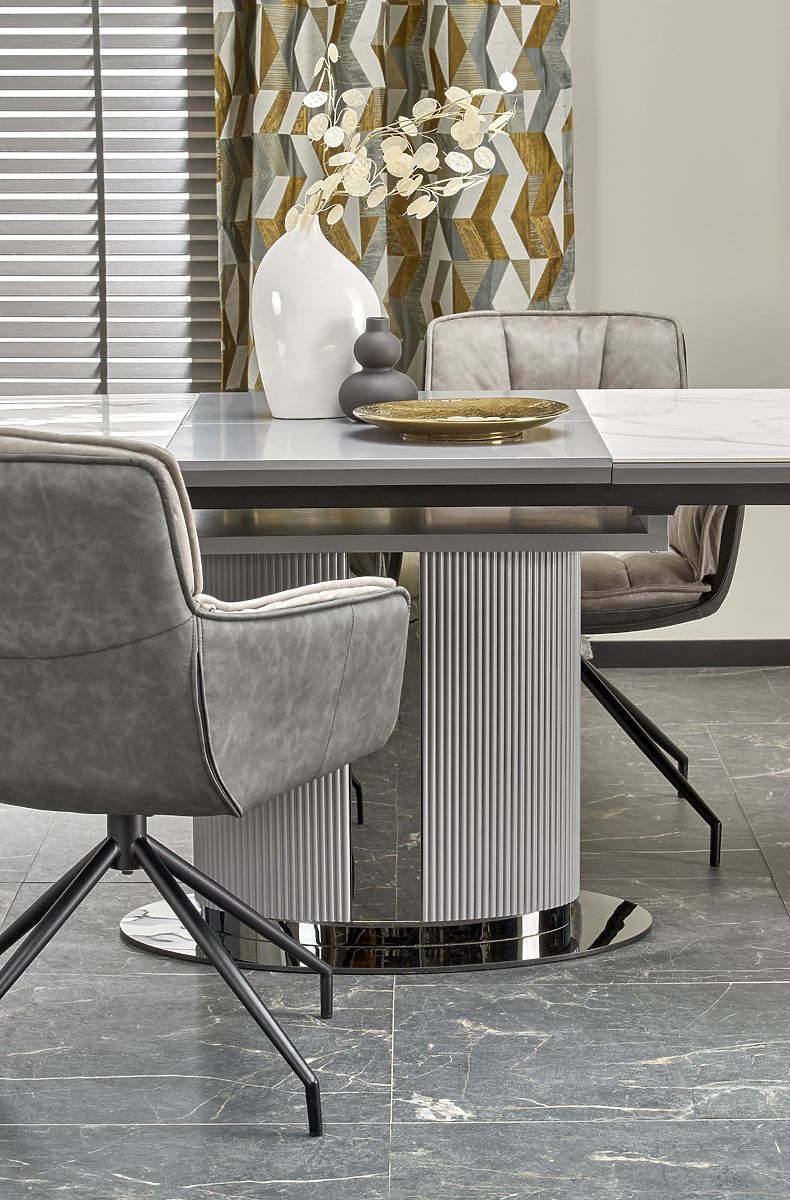 Table extensible en marbre blanc et gris avec pieds gris clair et noir. .. plus