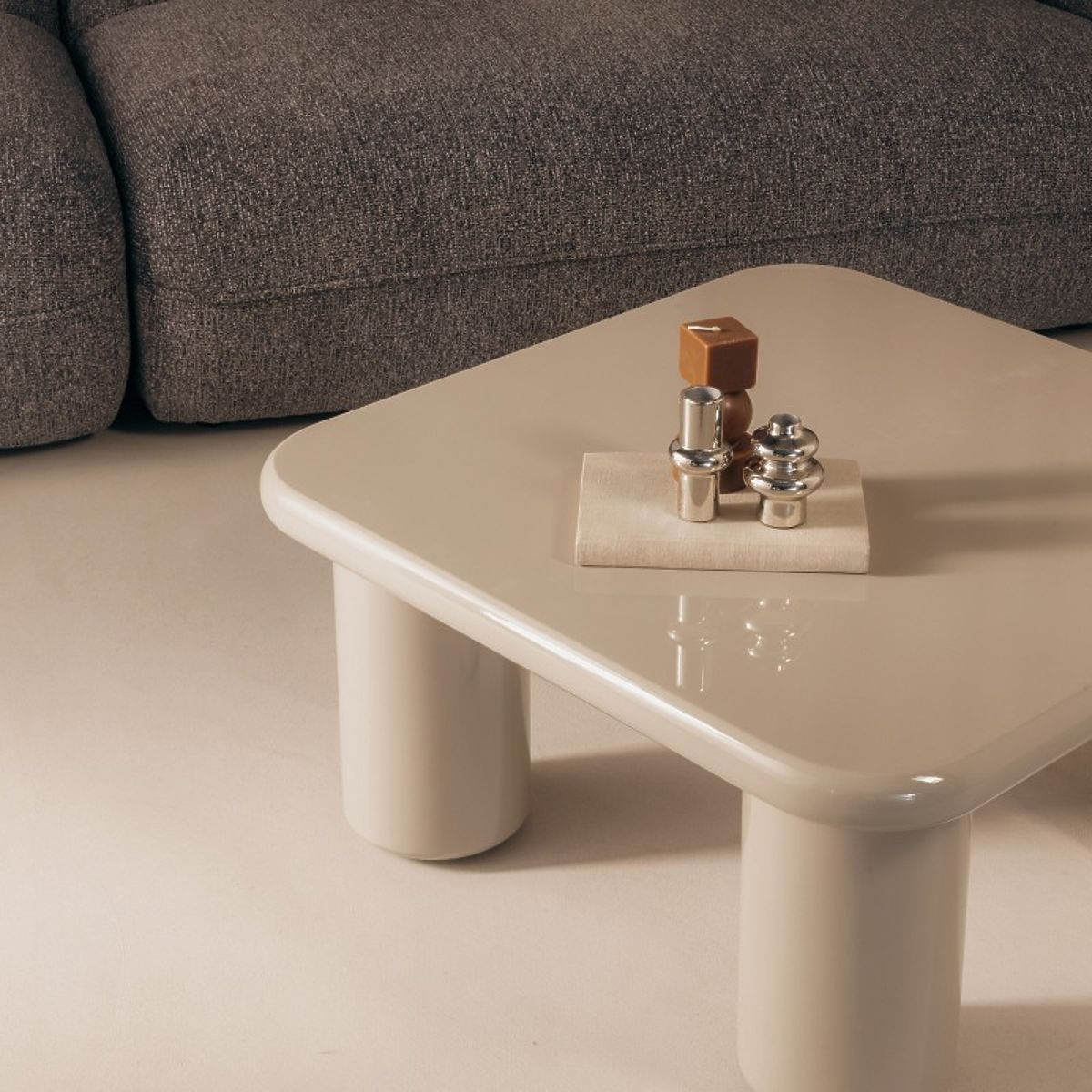 Table basse moderne beige foncé avec surface brillante et pieds solides. .. plus