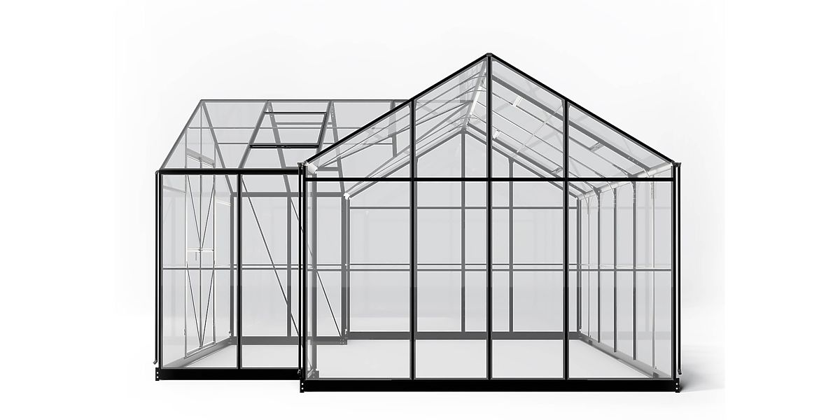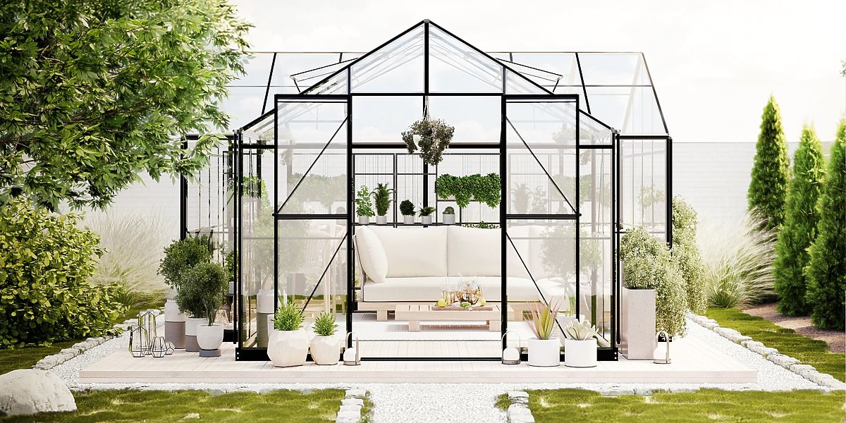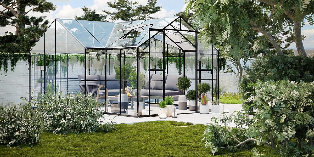 Orangerie de jardin avec structure en aluminium et verre trempé pour la culture des plantes. .. plus