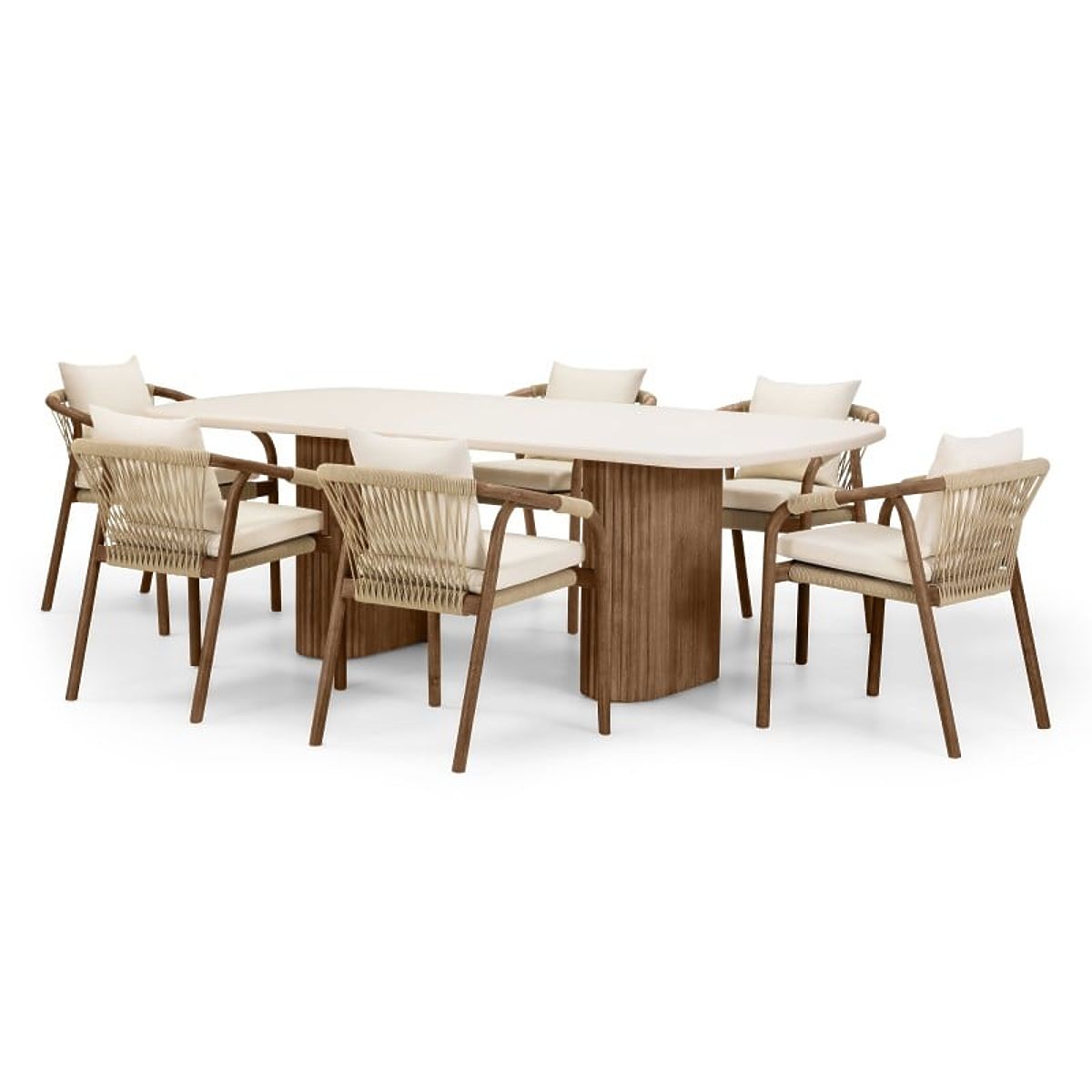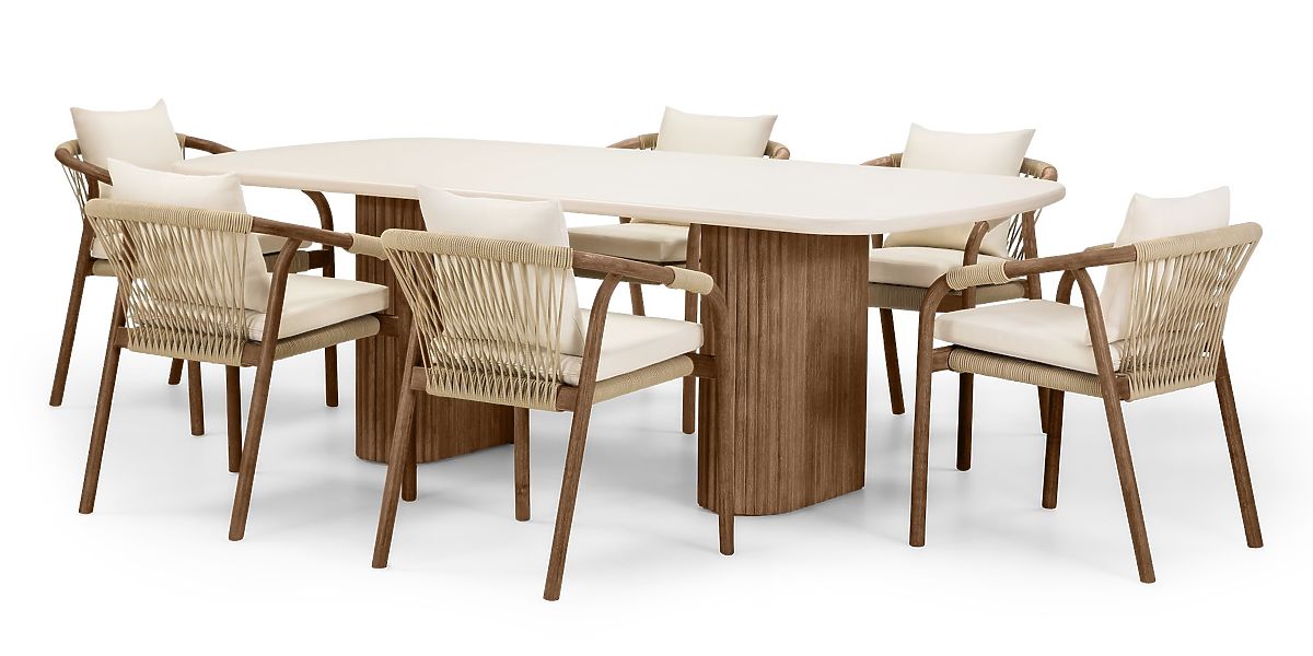 Ensemble de jardin Rovigo table avec plateau en pierre 220 cm et 6 chaises avec corde tressée, bois