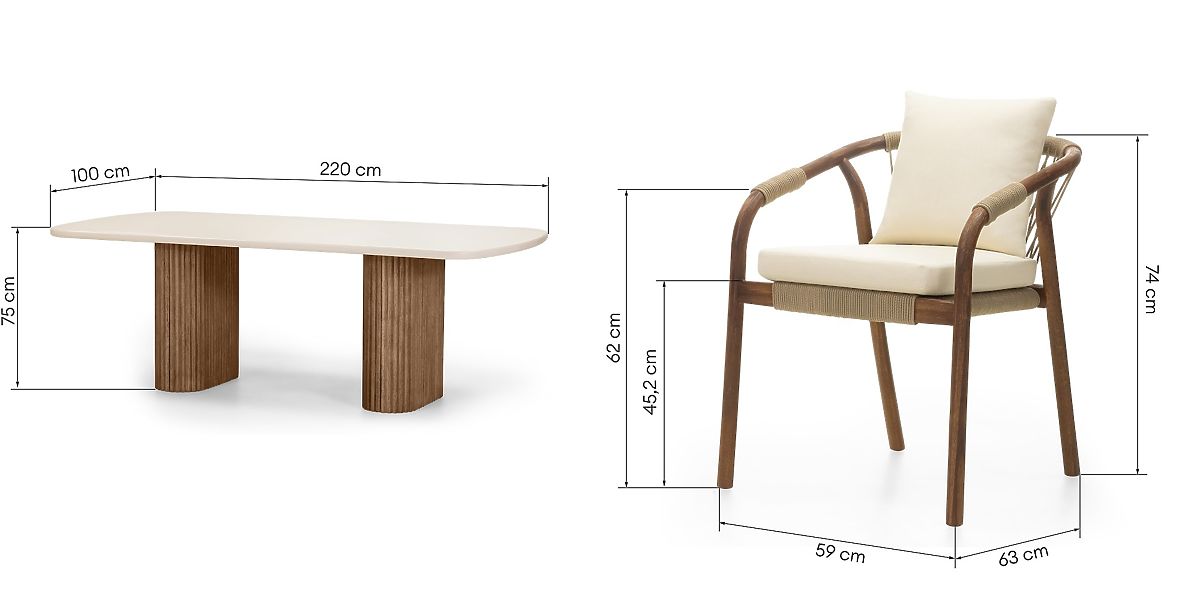 L'élément central de l'ensemble est une table avec un plateau beige clair, fabriqué en Superstone, un matériau composite qui imite parfaitement la pierre naturelle tout en étant beaucoup plus résistant aux intempéries et aux rayons UV. Ses bords légèrement arrondis ajoutent de la légèreté, tandis que les pieds massifs en lattes de bois d'acacia soulignent l'élégance et apportent un caractère chaleureux et naturel.