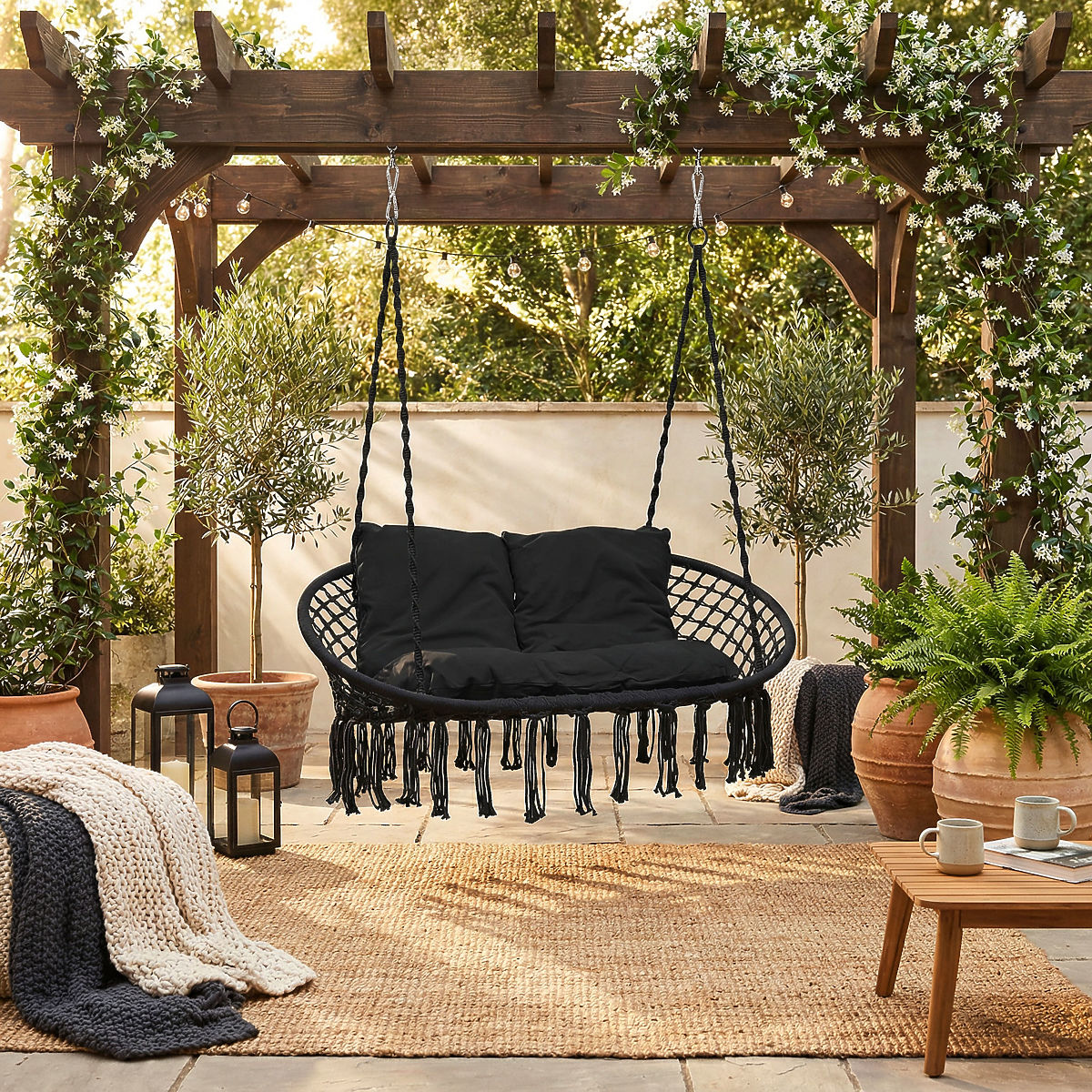 La balançoire de jardin Lagos est la dernière tendance en design d'intérieur. Parfait pour se détendre à deux, elle peut supporter jusqu'à 300 kg. Le cadre en acier est recouvert de magnifiques motifs tressés de style bohème. Les cordes qui soutiennent le siège confortable se terminent par des anneaux métalliques, ce qui facilite grandement le montage de la balançoire en un ou deux points. Les coussins doux inclus dans le set forment une composition agréable à l'œil et augmentent considérablement le confort d'utilisation.