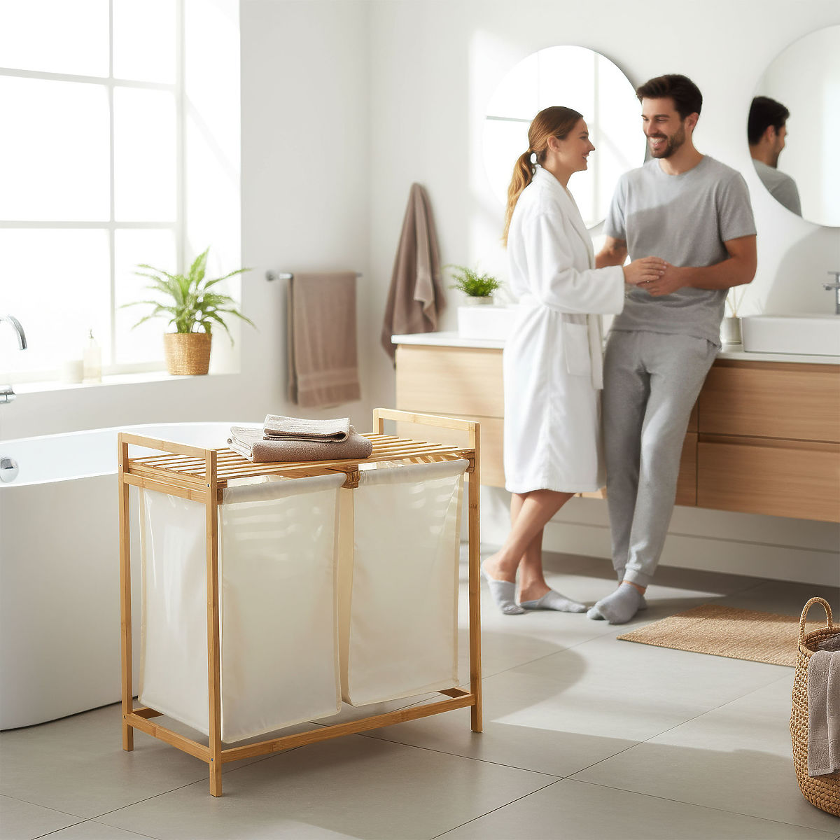 Le panier à linge Hanoi en bambou est un panier esthétique et spacieux qui peut contenir beaucoup de vêtements. Fabriqué en bambou brossé, il n'a pas de bords tranchants, est agréablement lisse et soigneusement fini. L'étagère supérieure peut servir de place pour les accessoires de salle de bain, les détergents, mais aussi pour les décorations ou les bougies parfumées. Le panier est équipé de rails qui facilitent le remplissage et la vidange du sac en textile. Grâce à eux, le sac entier peut être retiré et transporté. Hanoi se monte sans perçage ni outils spécialisés. Le montage prend littéralement un instant et tout ce dont vous avez besoin pour l'assembler est inclus dans l'emballage.