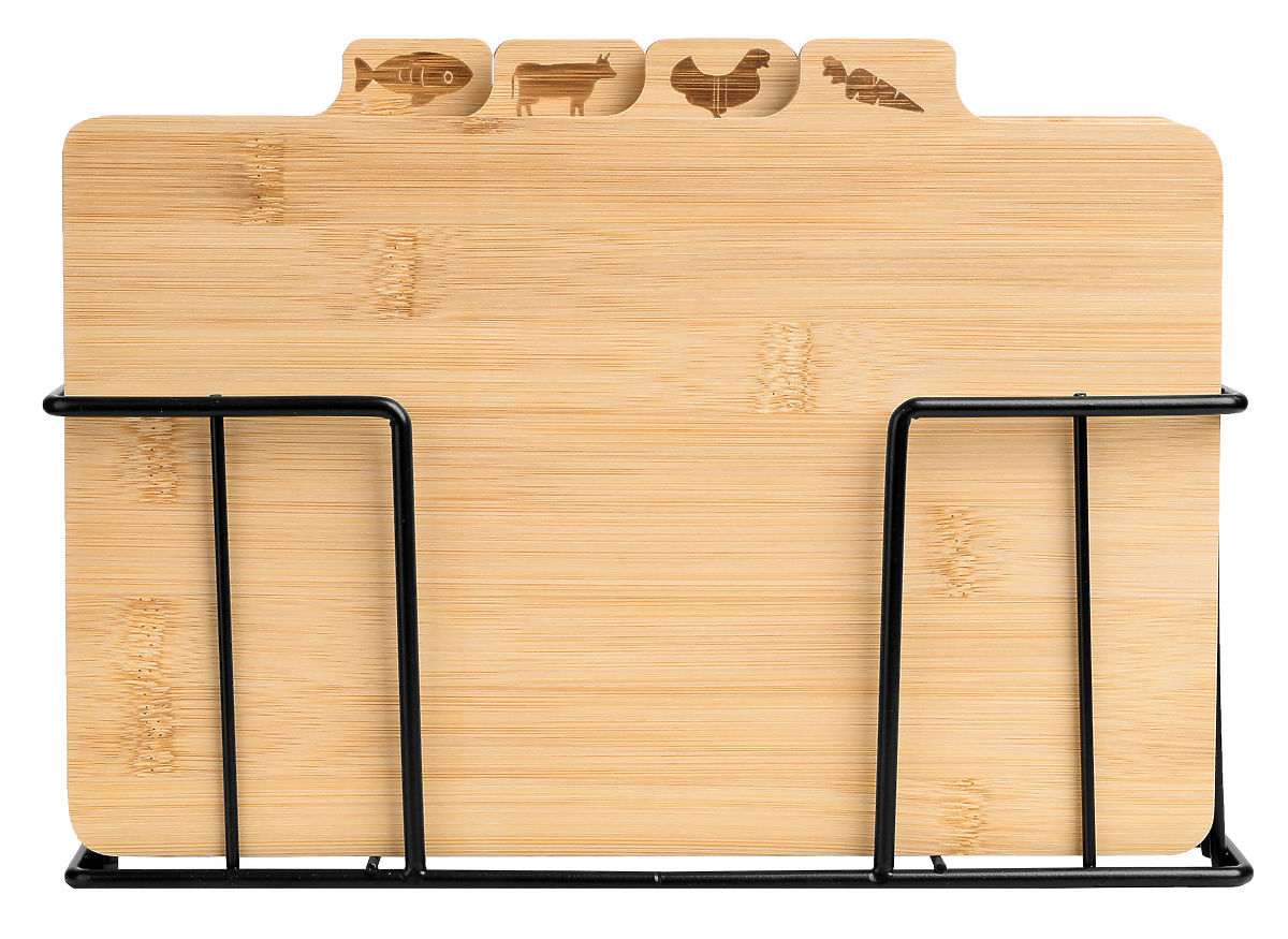 Skara est un ensemble pratique et élégant de planches en bambou placées sur un support en acier avec un revêtement en poudre noir. Chaque planche a une utilisation spécifique. Les planches sont destinées aux légumes, à la volaille, à la viande et au poisson. Grâce aux marquages placés, vous aurez la certitude d'utiliser la planche dédiée appropriée. L'ensemble prend peu de place et chaque planche est toujours à portée de main. L'ensemble assure une hygiène adéquate lors de la préparation des repas. Les planches sont fabriquées en bois de bambou naturel, ce qui les rend résistantes à l'humidité et aux déformations, n'absorbent pas les odeurs et sèchent rapidement. Le bois de bambou est un matériau écologique naturel, sûr pour la santé.