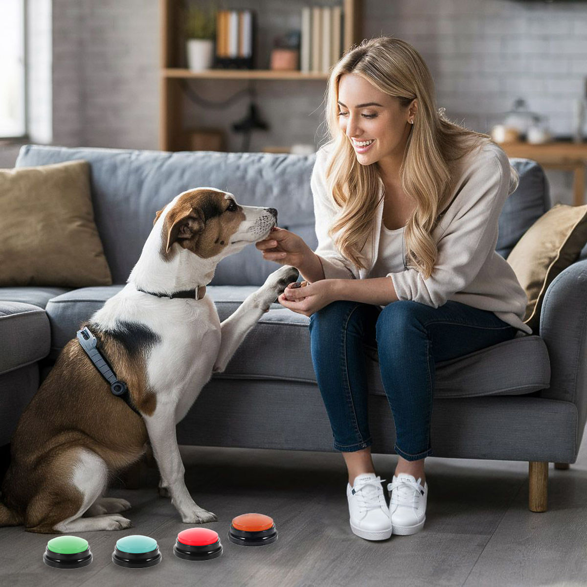 Souhaitez-vous améliorer la communication et renforcer le lien avec votre animal de compagnie ? Notre ensemble de 4 boutons sonores pour chien Talker est la solution idéale ! Grâce à ce produit innovant, vous pouvez enregistrer des sons qui vous aideront à communiquer facilement et intuitivement avec votre animal, tout en vous amusant !