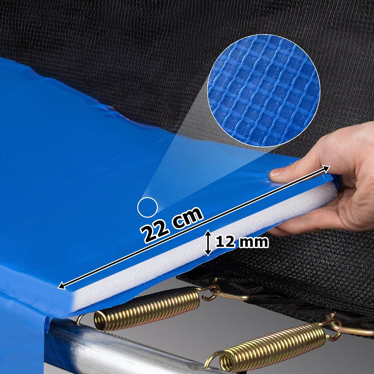Matériau du tapis de saut : PP (polypropylène) avec un grammage de 275g/m2 - pour le confort et la sécurité lors du saut.