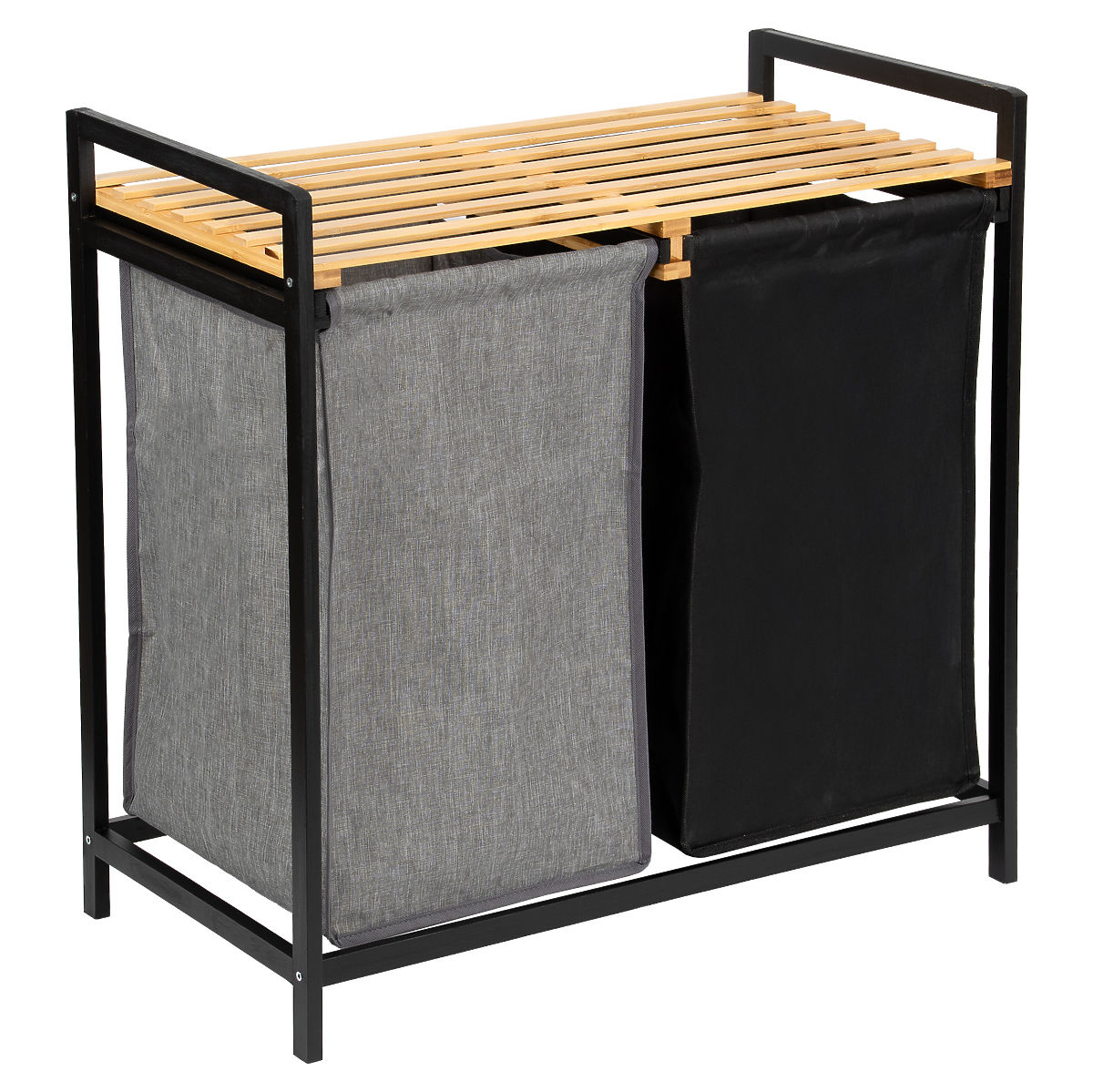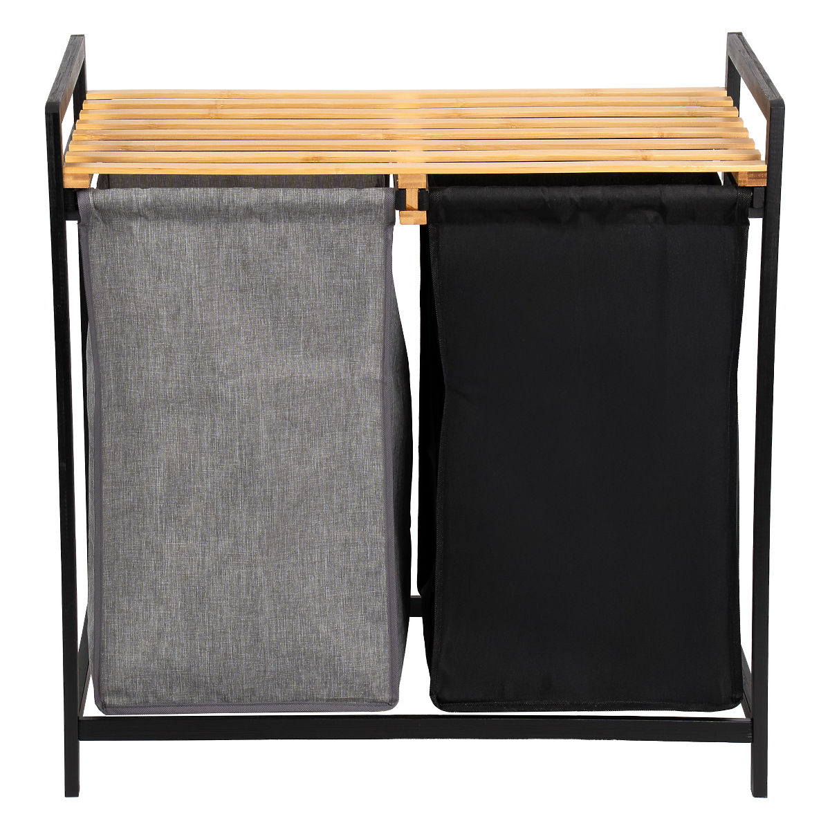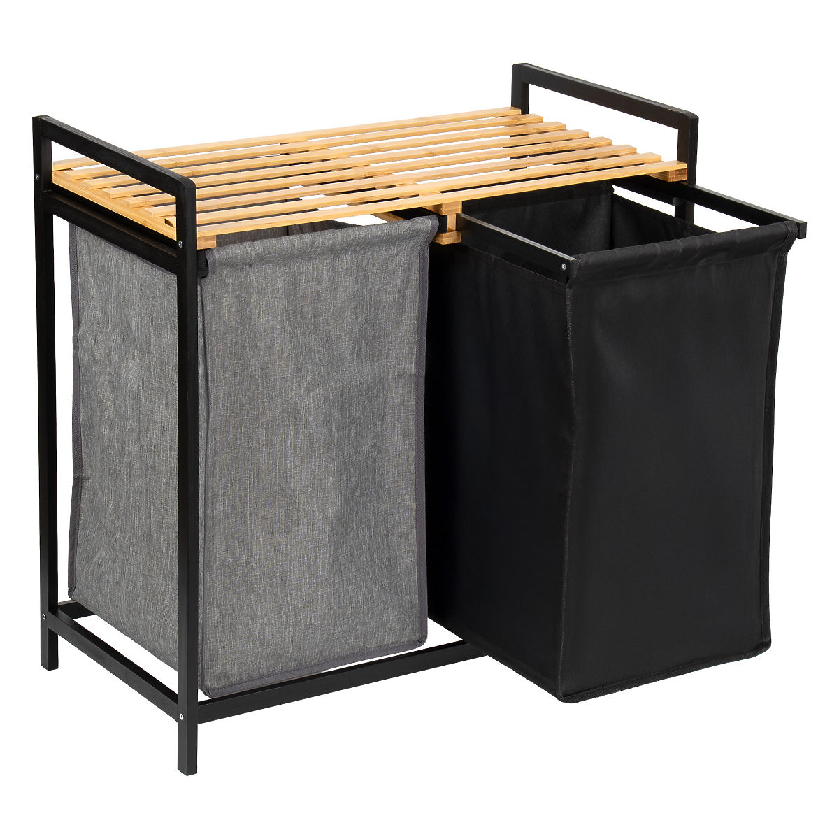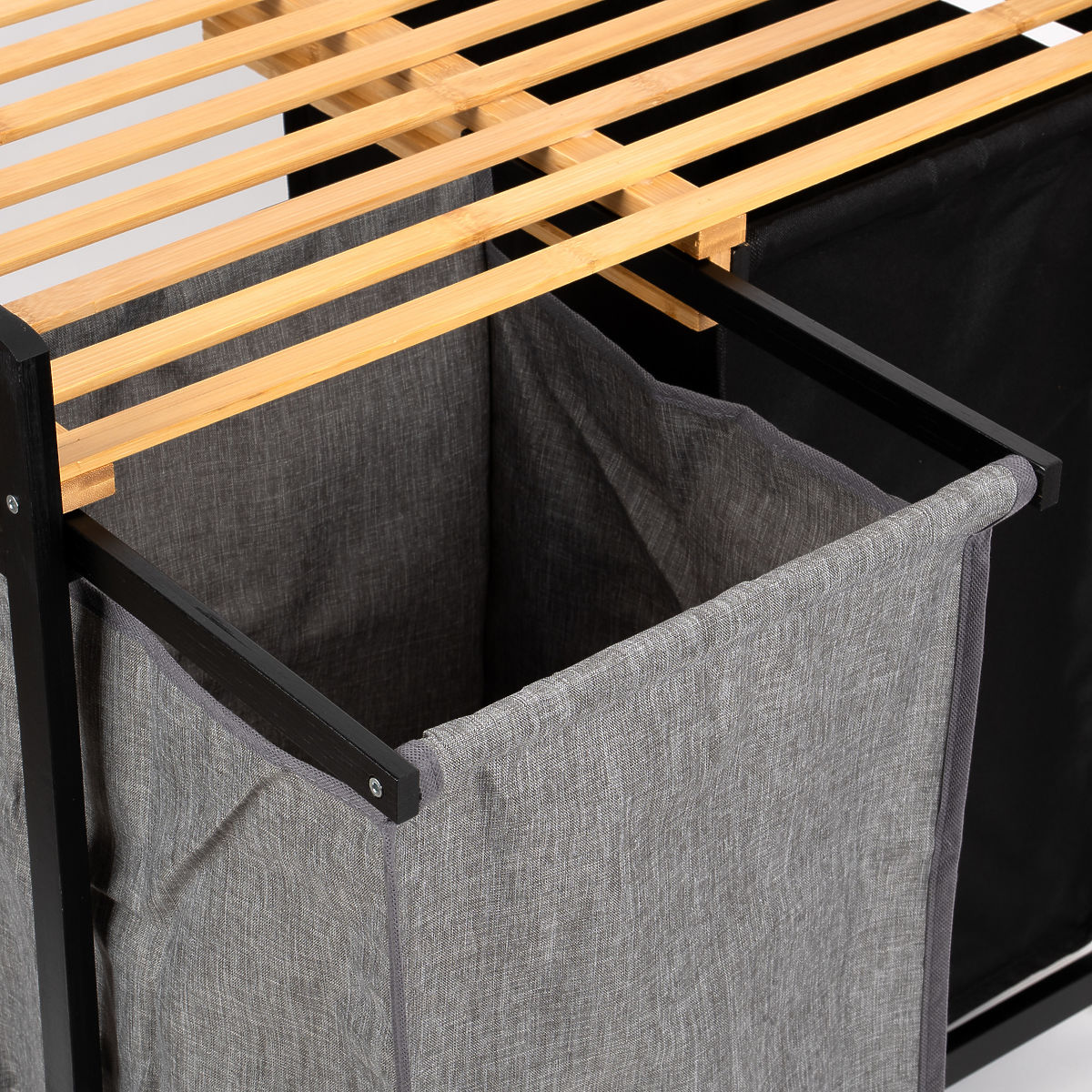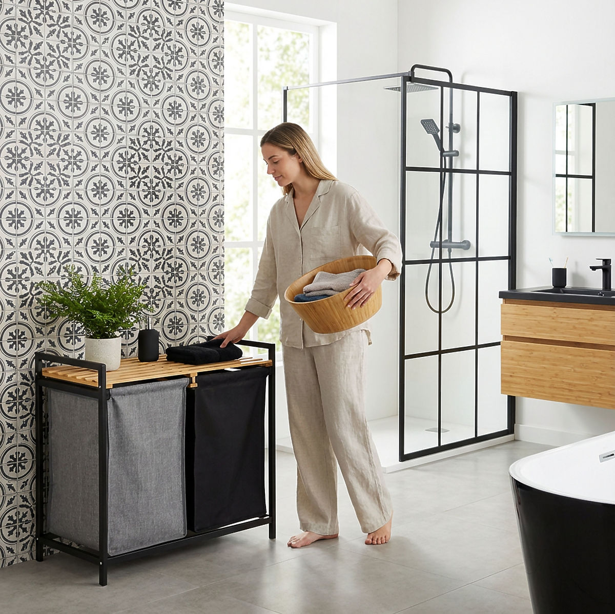 Le panier en bambou pour linge Hanoi Black Duo Couleur est une solution élégante et fonctionnelle pour une salle de bain moderne. Sa capacité de 80 litres et sa division en deux compartiments facilitent le tri du linge. Une étagère supérieure pratique est idéale pour les détergents, accessoires ou décorations. Les paniers en tissu peuvent être facilement retirés et le montage simple sans perçage permet de préparer rapidement le panier à l'utilisation. Parfait pour les intérieurs loft et modernes.
