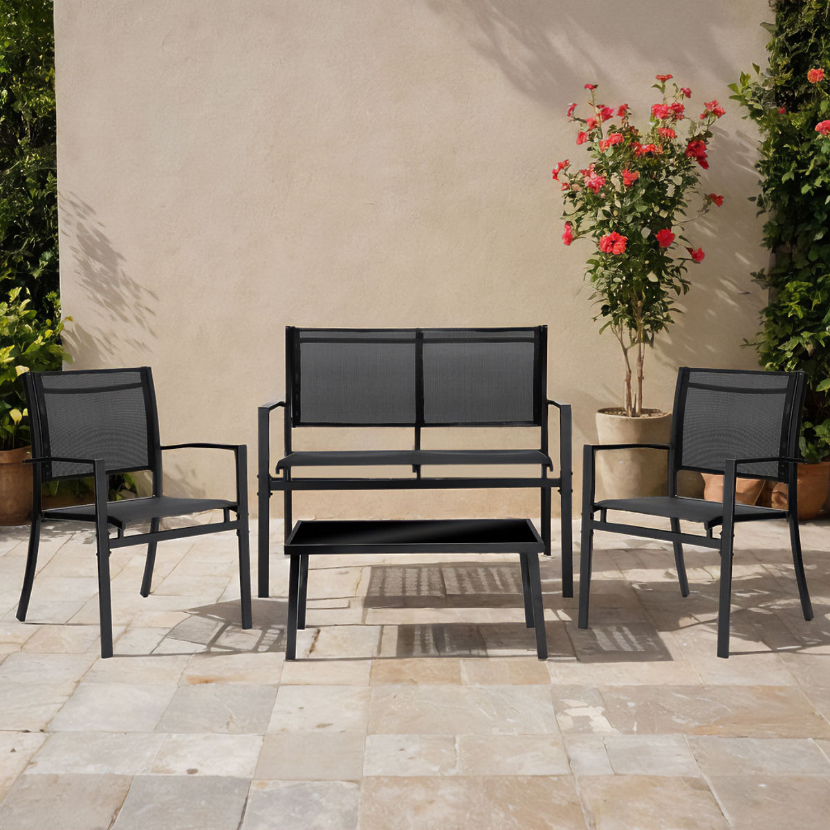 L'ensemble comprend : un canapé deux places, deux fauteuils et une table avec plateau en verre trempé, ce qui crée un ensemble idéal pour se détendre en plein air.