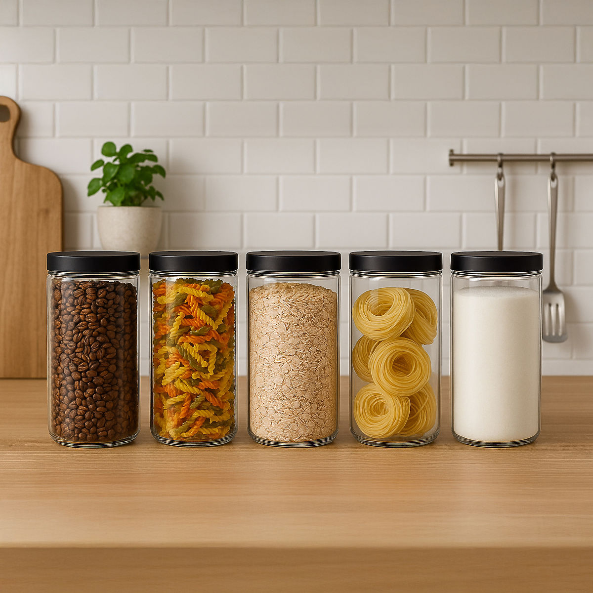 L'ensemble de récipients Frasco est la solution idéale pour ceux qui apprécient l'ordre, l'esthétique et la fonctionnalité dans la cuisine ou le garde-manger. Grâce à eux, vous pouvez facilement trier les produits en vrac et les couvercles à vis garantissent que les aliments restent frais plus longtemps, créant ainsi un espace harmonieux où chaque chose a sa place. Les parois transparentes facilitent le contrôle du contenu et les étiquettes fournies permettent un marquage intuitif de chaque récipient – fini de chercher la farine, le sucre ou les pâtes.