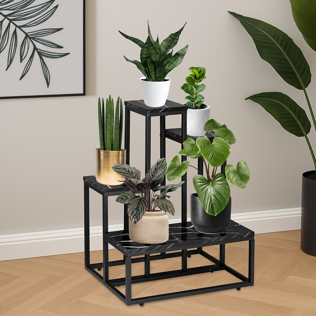 ✔️ Élégance marbrée – Les étagères laminées en couleur marbre noir confèrent un caractère luxueux au support pour plantes. La surface laminée non seulement a un aspect élégant, mais met également en valeur les plantes et décorations.