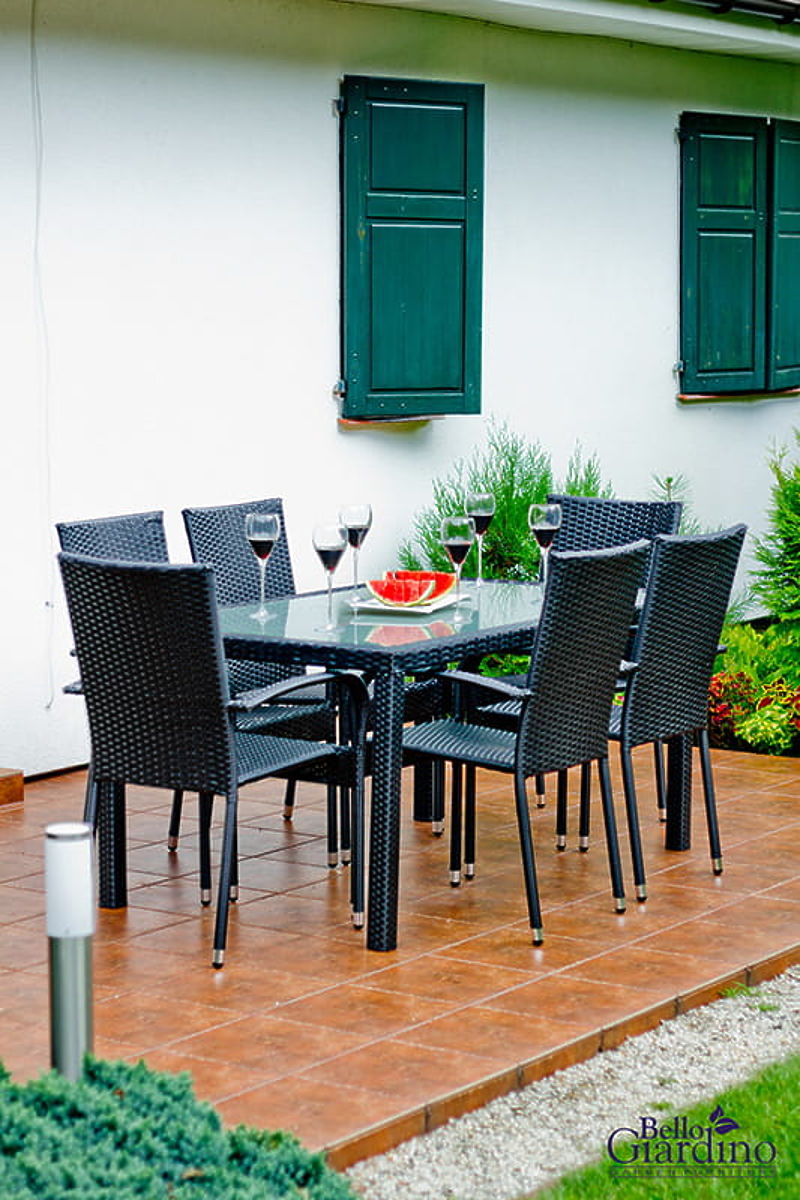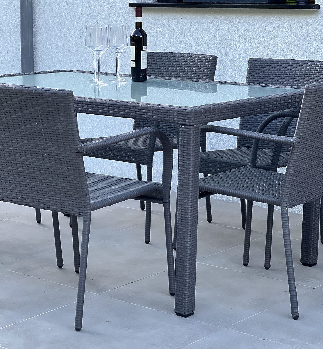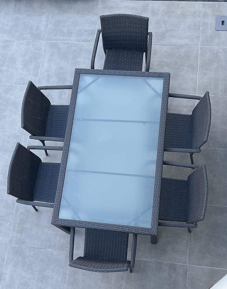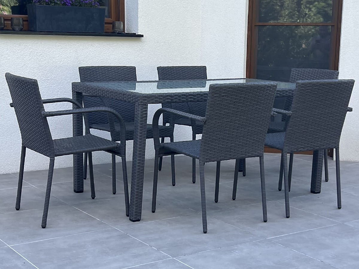 Structure du mobilier : table – aluminium, chaises – acier L'ensemble comprend 7 pièces : 1 × table (avec plateau en verre mat de sécurité de 5 mm) : longueur 150 cm, largeur 90 cm, hauteur 74 cm6 × chaises : largeur 56 cm, profondeur 50 cm, hauteur 84 cm, hauteur de l'assise depuis le sol 44 cm, hauteur du dossier depuis l'assise 43 cm, largeur de l'assise 40 cm, profondeur de l'assise 43 cmL'ensemble est livré sur 1 palette de dimensions 120 × 80 × 170 cm, poids 60 kg. Possibilité d'acheter des coussins pour les chaises ici. Les chaises peuvent être utilisées immédiatement après déballage. Les chaises sont empilables (peuvent être insérées les unes dans les autres), ce qui facilite grandement le stockage et économise de l'espace. La table est conçue pour un montage simple par soi-même selon les instructions fournies. La table en verre mat est insérée dans un cadre en résine tressée. La résine tressée est résistante aux intempéries, mais pour préserver l'apparence plus longtemps, nous recommandons l'achat d'une housse de protection. La housse de couleur gris foncé est unie et possède un cordon de serrage en bas. Toutes les housses sont faites sur mesure, le délai de réalisation est d'environ 14 jours ouvrables.