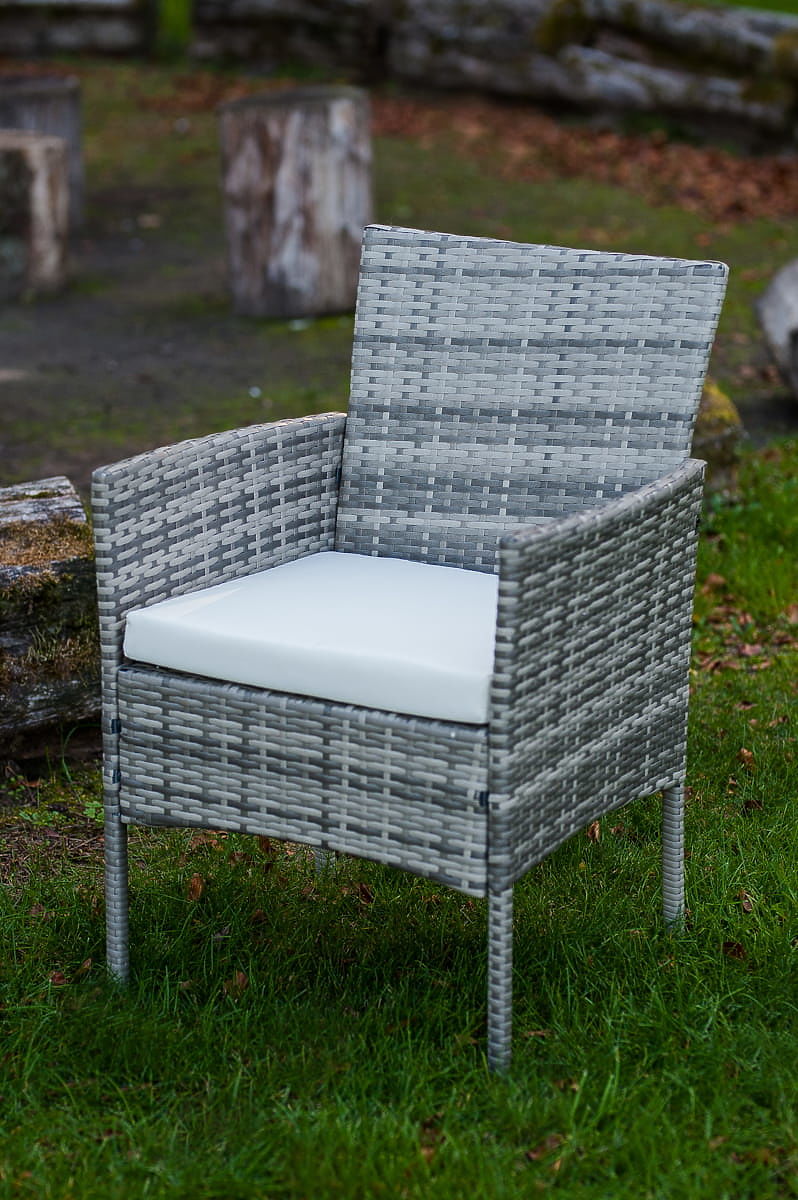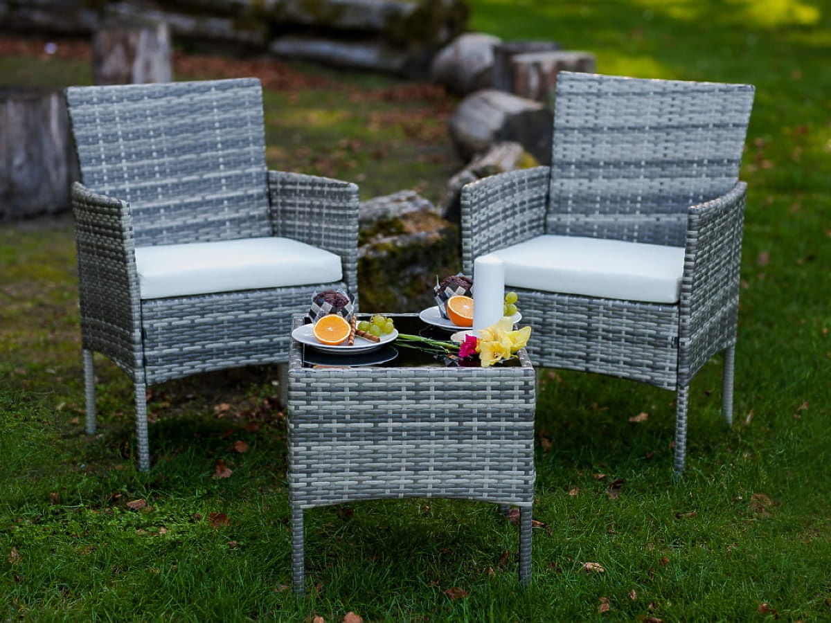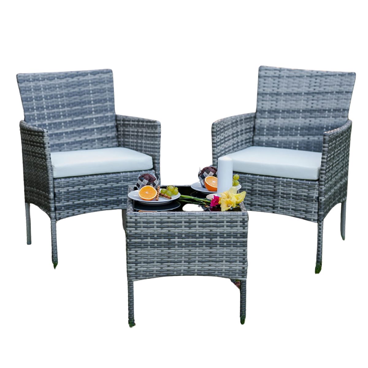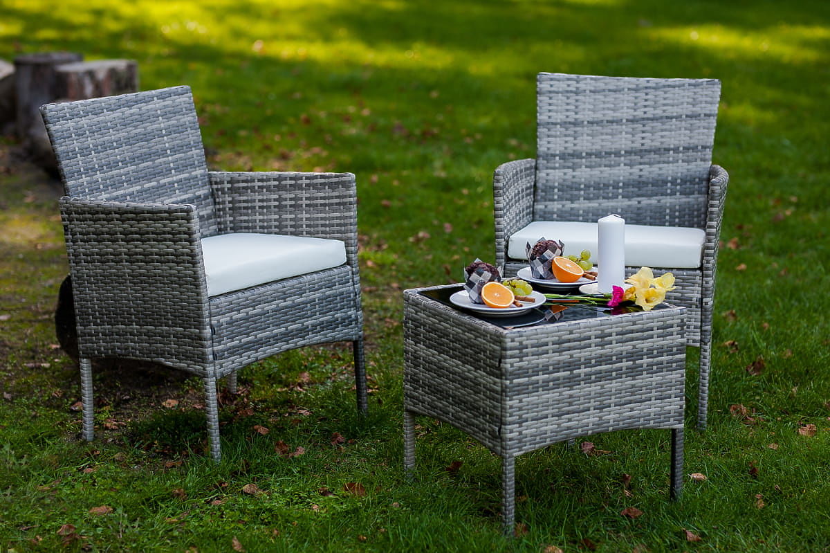 Ensemble de mobilier de balcon (2 x fauteuil + table) SANO en résine tressée grise