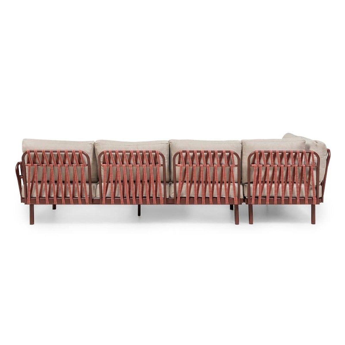Canapé d'angle Amarello – élégance douce en forme harmonieuse. Structure en aluminium de couleur marron rougeâtre, tressage résistant et coussins confortables créent un espace sophistiqué pour se détendre, complété par une table pratique et une étagère latérale.