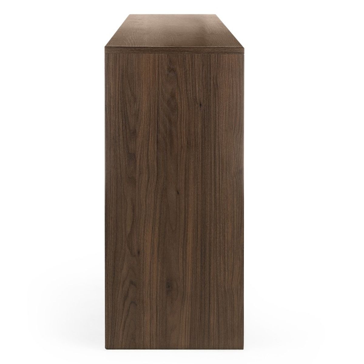 La commode à quatre portes Moku combine un design minimaliste avec fonctionnalité. L'arrondissement unique des surfaces avant et la couleur noyer villa lui confèrent légèreté et élégance, ce qui la rend parfaite pour tout intérieur.