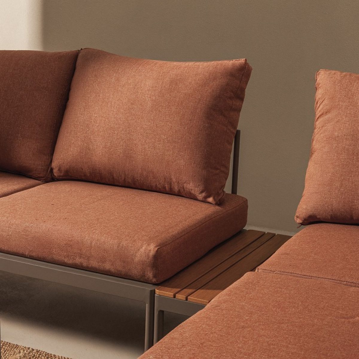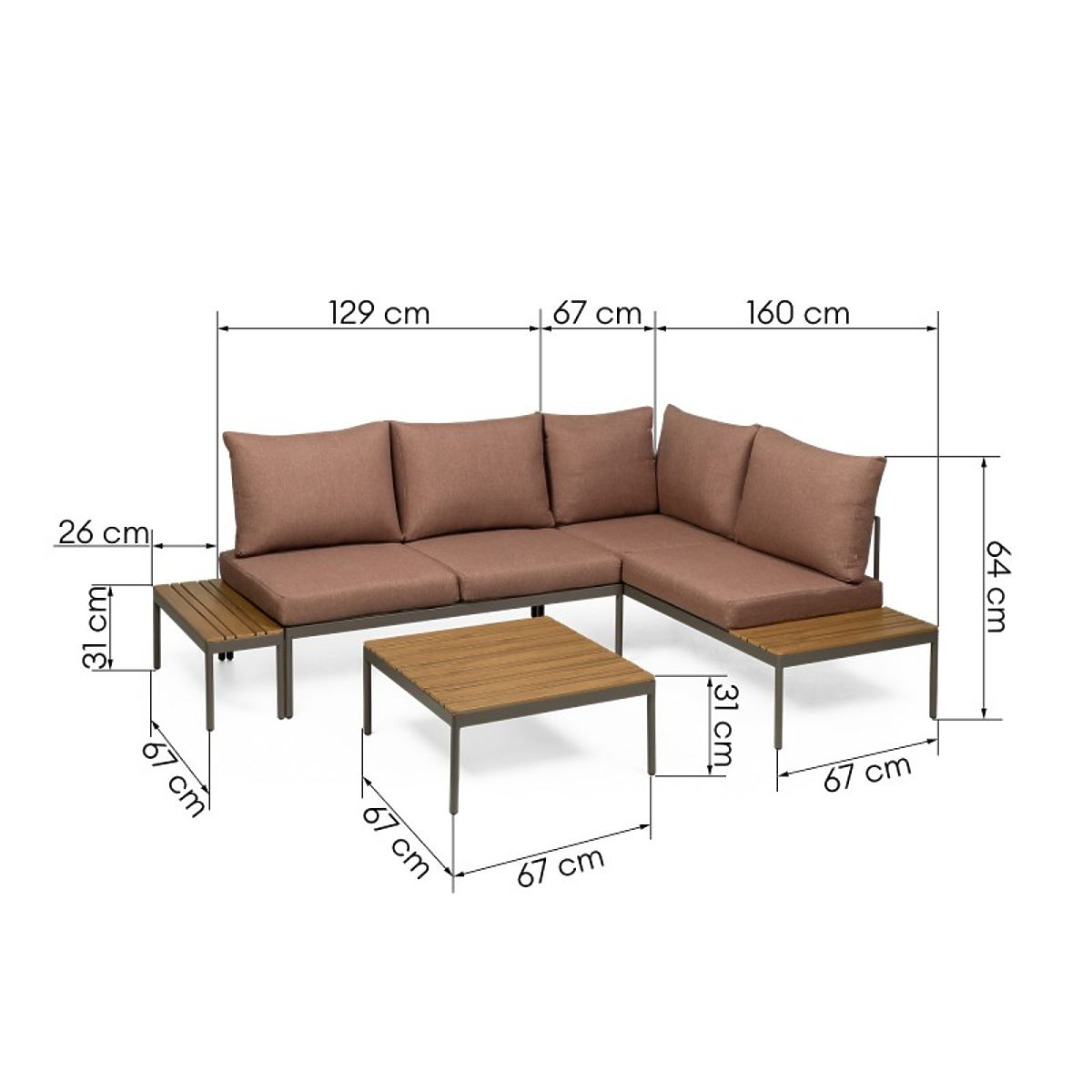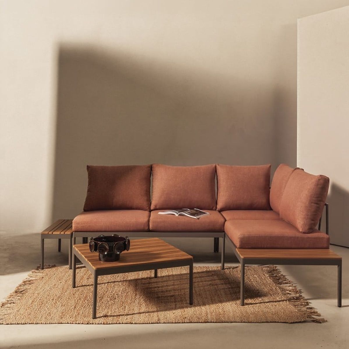 Lugi est un canapé d'angle conçu pour un repos flexible. Sa construction modulaire permet de changer facilement la disposition, de l'adapter à l'espace et aux occasions. Les coussins moelleux de couleur moka assurent le confort et les plateaux en polywood confèrent à l'ensemble un aspect moderne et uniforme.