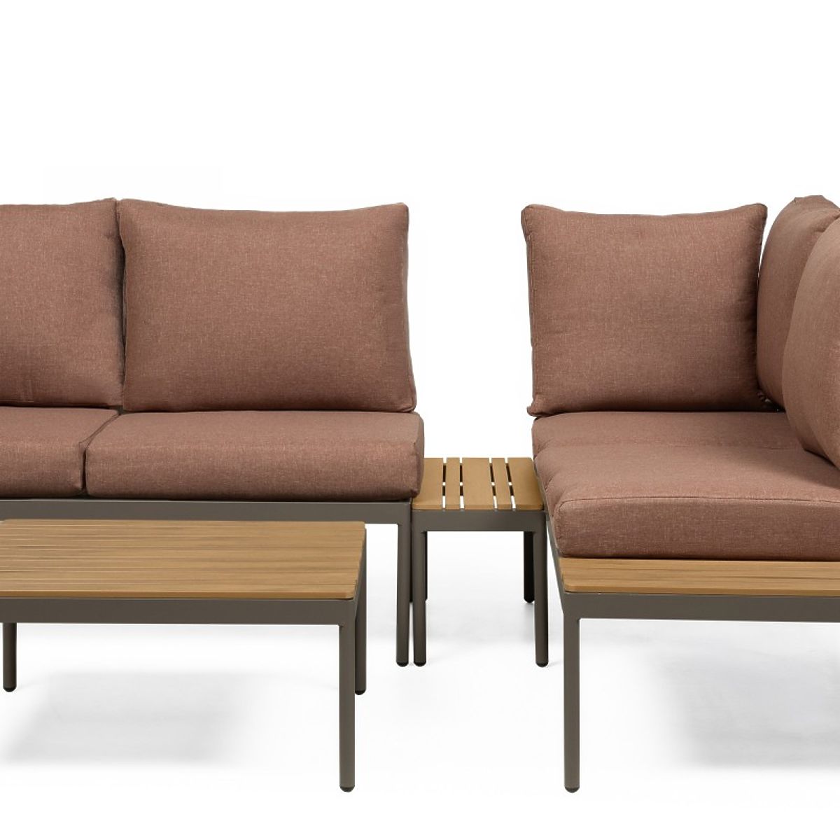 Canapé d'angle de jardin modulaire avec coussins moka et tables assorties. .. plus