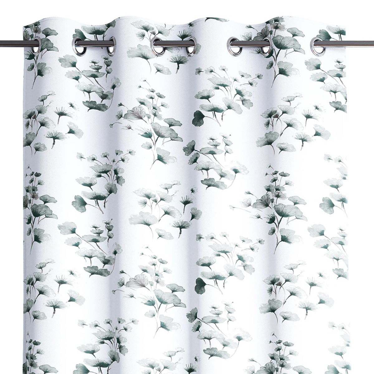 Rideau blanc avec motif végétal et œillets métalliques argentés. .. plus