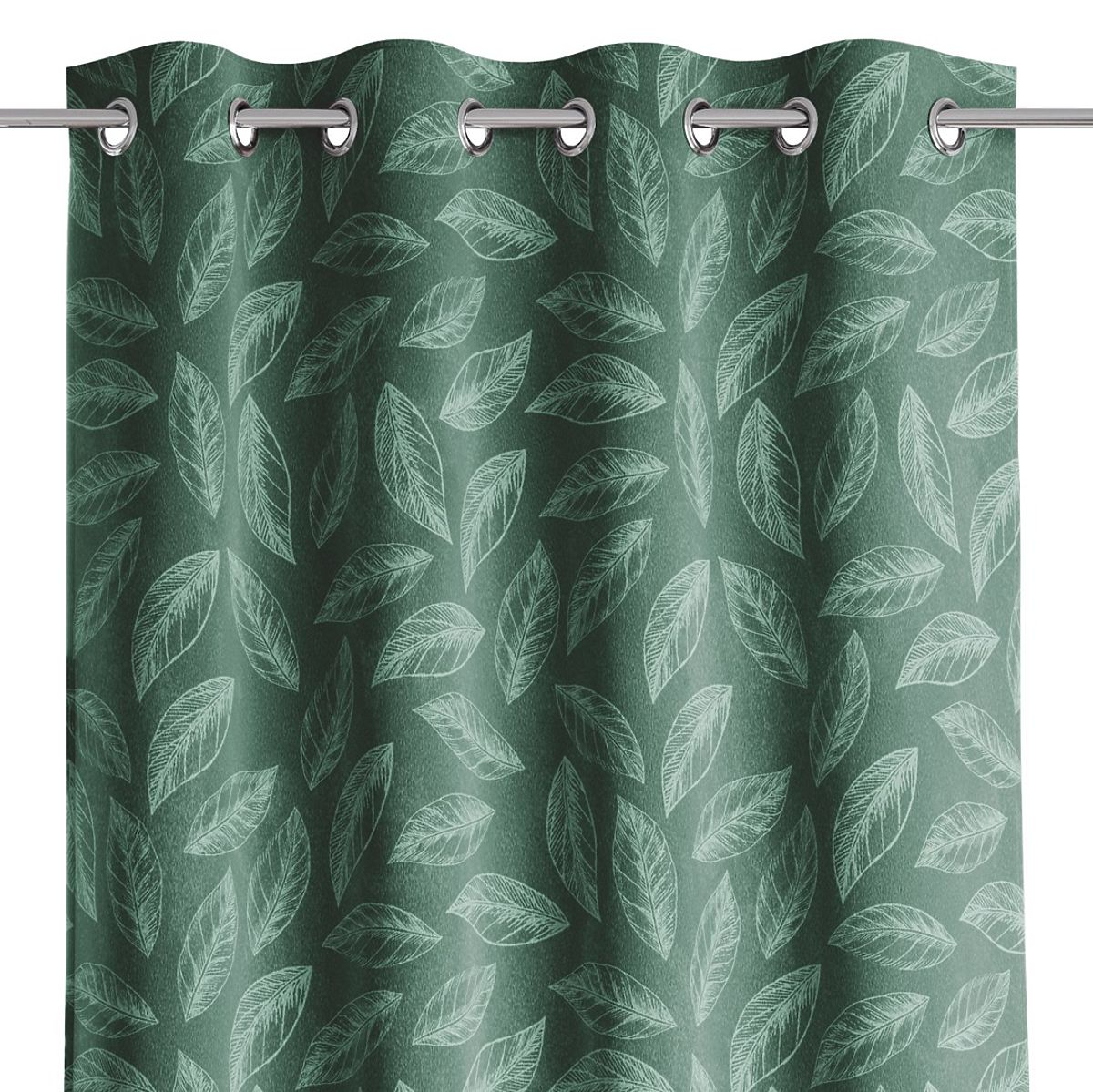 Rideau vert bouteille avec motif végétal et œillets métalliques argentés. .. plus