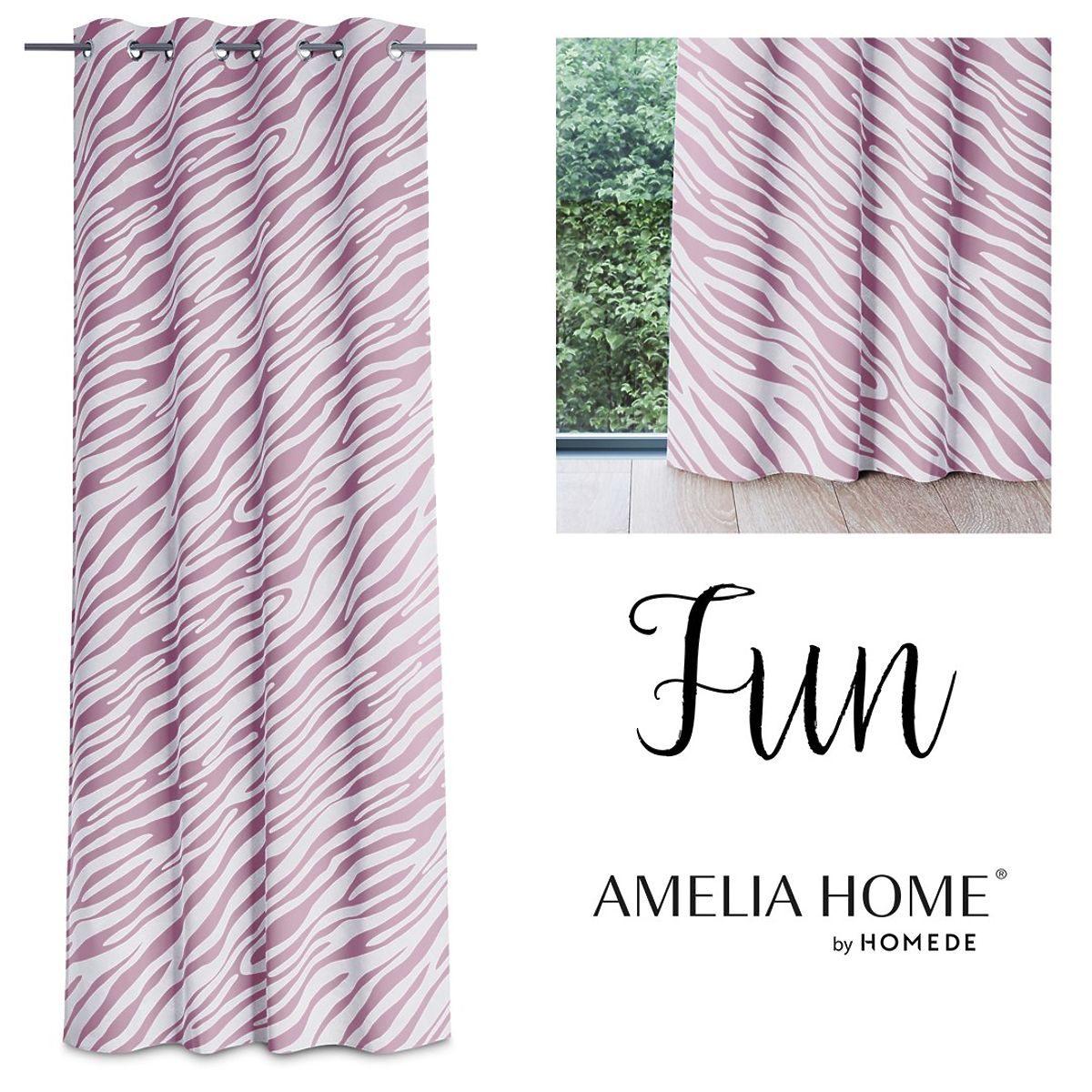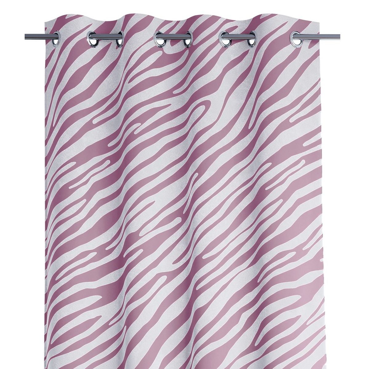 Rideau rose avec motif animalier et œillets métalliques argentés. .. plus
