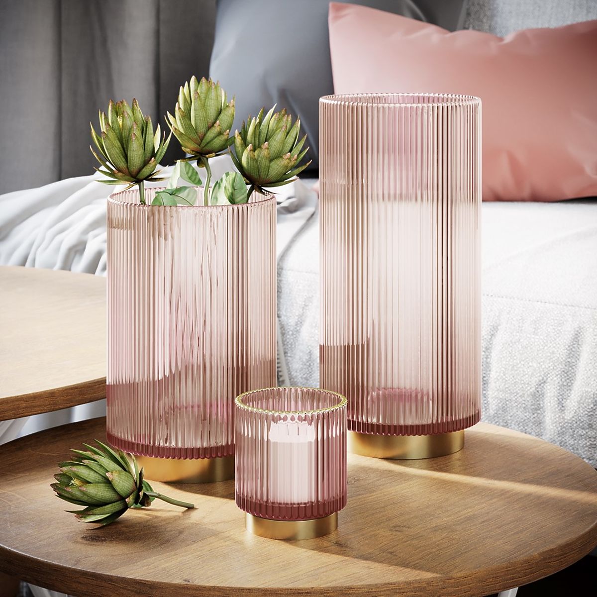 Bougeoir en verre rose poudré de la collection Pompey. .. plus