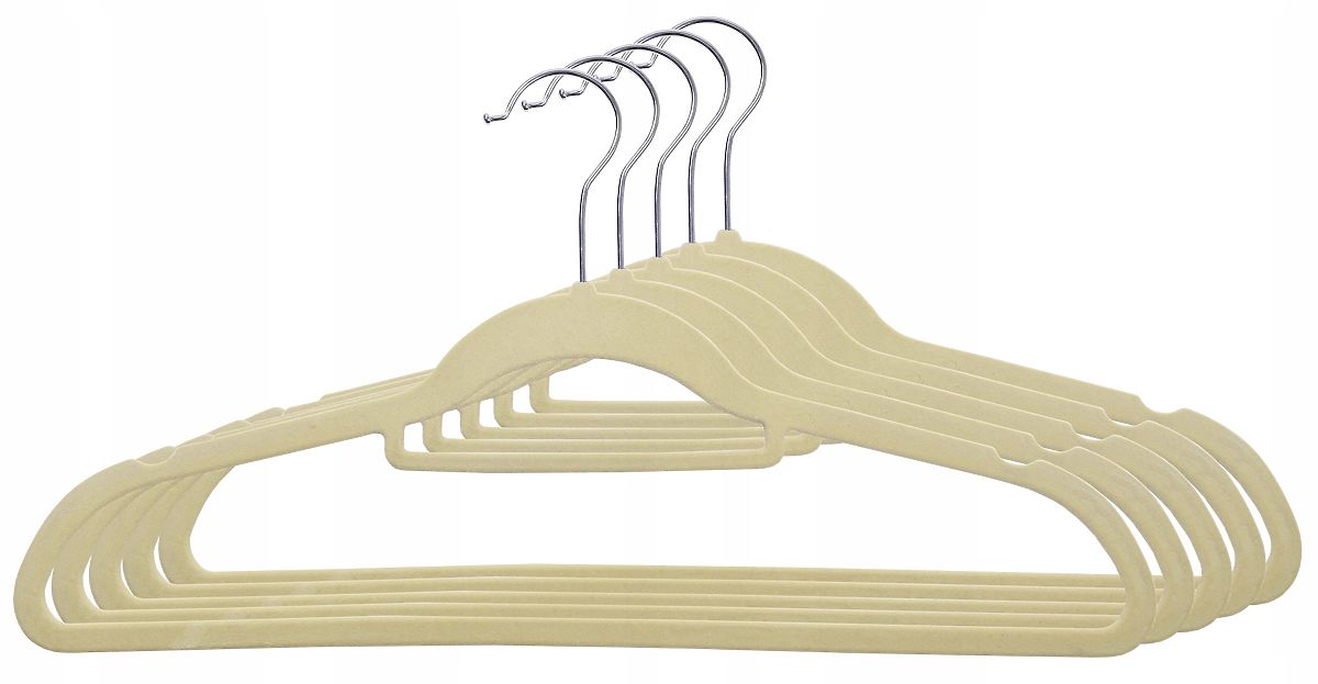 Ensemble de cintres en velours. La surface floquée les rend très pratiques car elle empêche les vêtements de glisser. Les cintres Maxi sont profilés de manière appropriée, ce qui aide à prévenir le froissement des vêtements. Le crochet en métal résiste à des années d'utilisation.